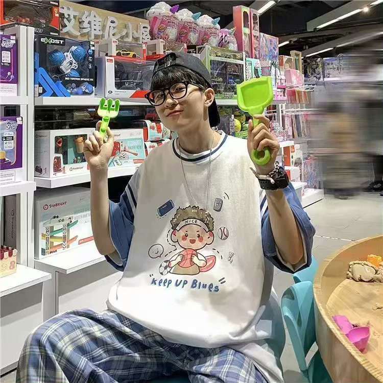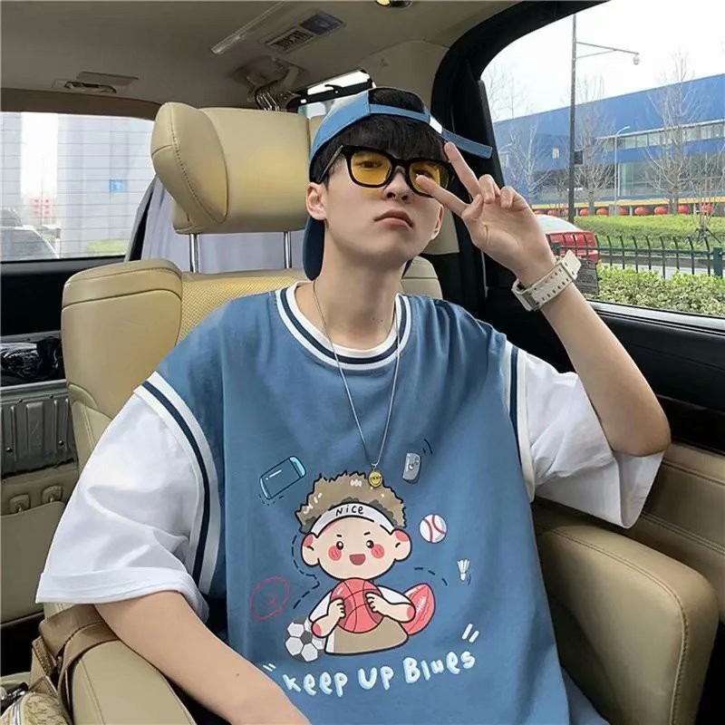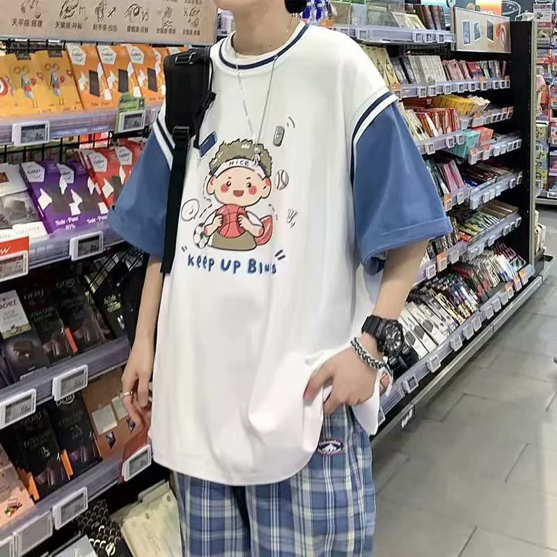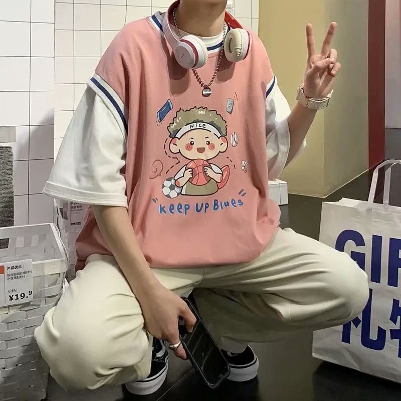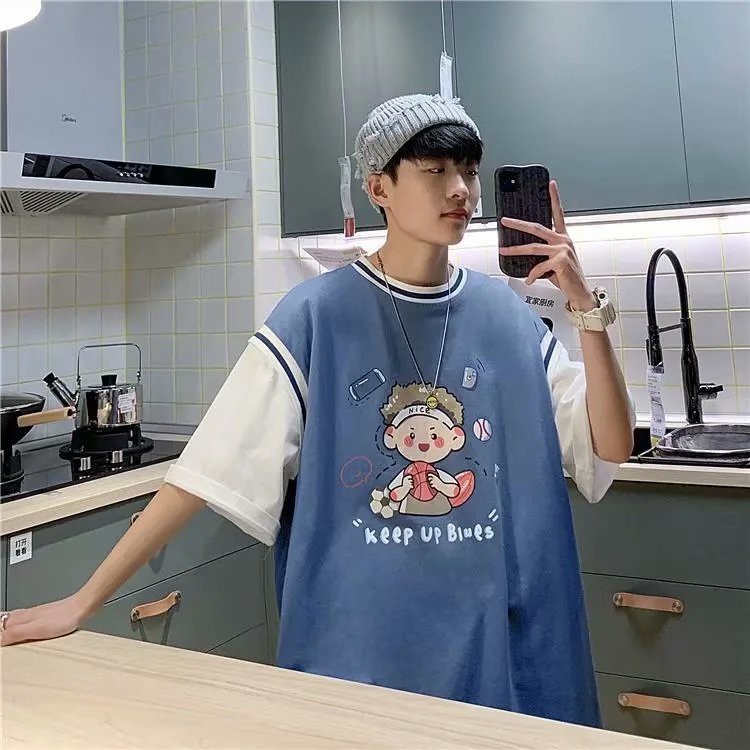潮牌假兩件印花T恤 情侶必備拼接T恤 韓版短袖港風5分袖T恤 原宿風T恤男 5分袖 印花T恤 男女衣著(LPT27)