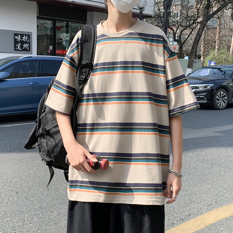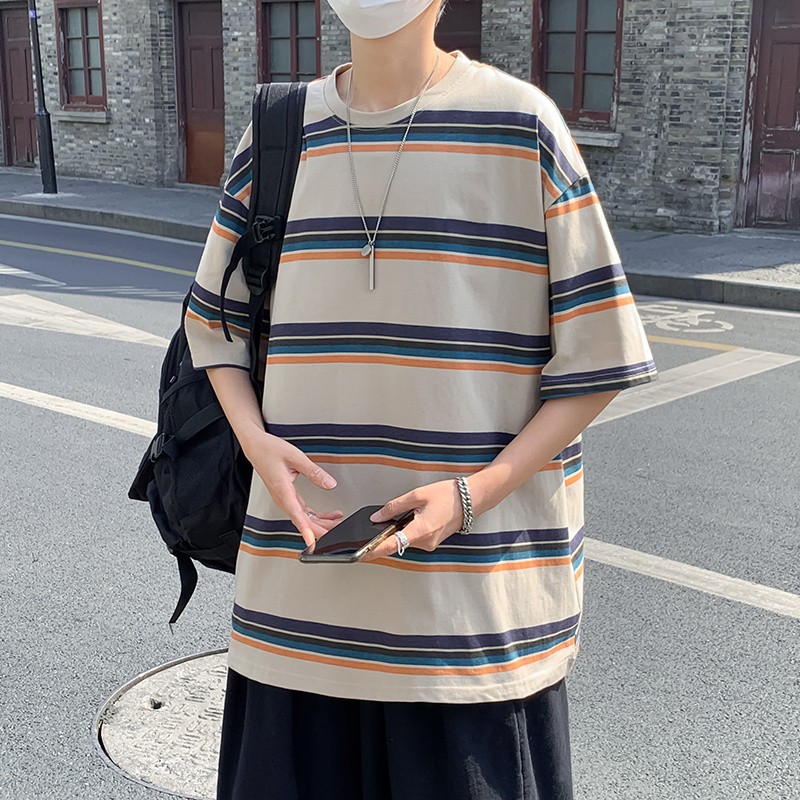 條紋夏季T恤 素t 潮流 日系 短袖T恤 男生 寬鬆 嘻哈 大尺碼 情侶 五分袖 印花T 短T(JYT30)【壹號站】