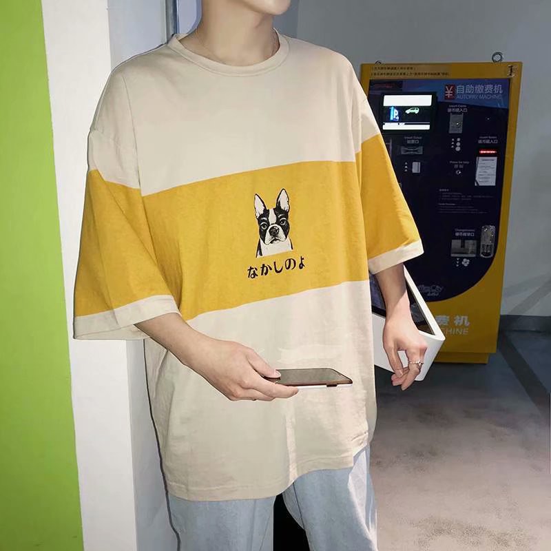 街頭潮牌男生短袖T恤 日系小狗印花寬鬆T恤男學生五分袖假兩件上衣 五分袖T恤(FD002)【壹號站】