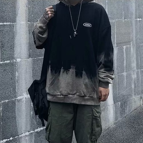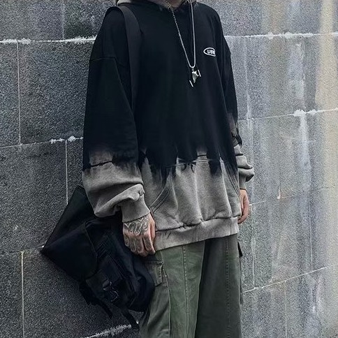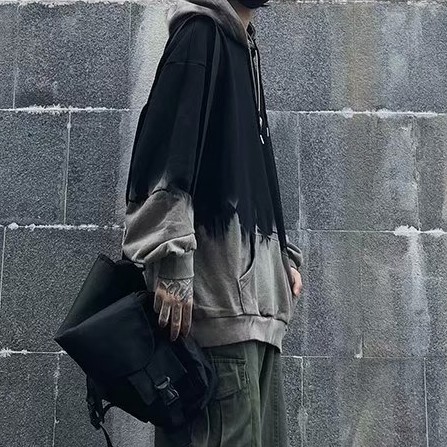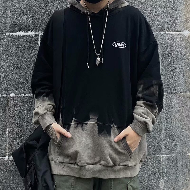 韓版扎染刷毛連帽長袖t恤男 寬鬆百搭圓領 漸變色情侶T恤 百搭落肩休閒T恤 長T 男生衣著(TFW10)【壹號站】