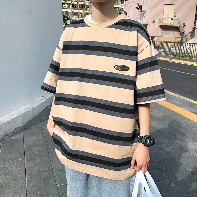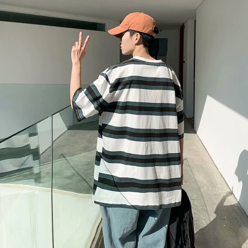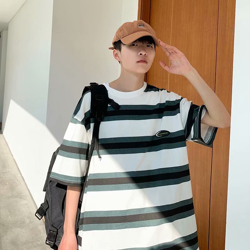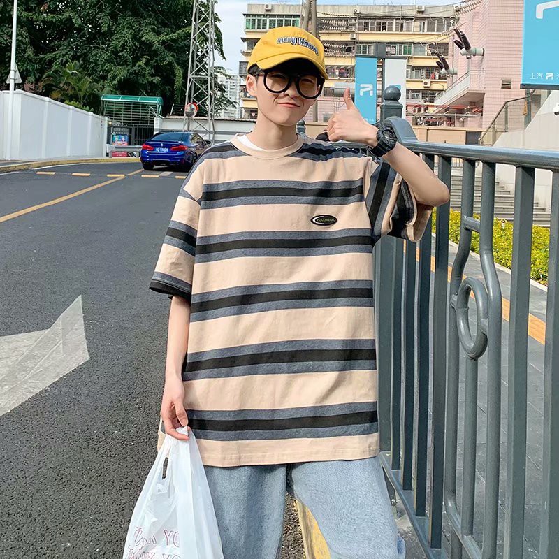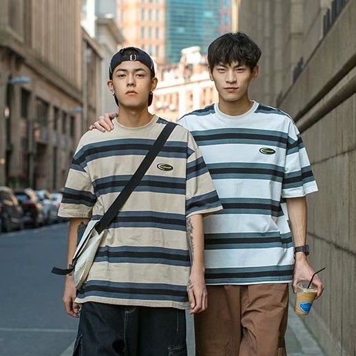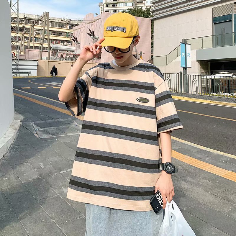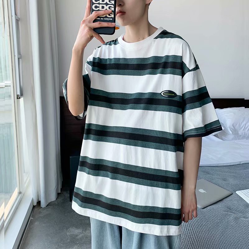 潮流條紋短袖T恤 彩條T恤 男生短袖T恤 男女可穿 寬鬆短T 學生T恤 短T 情侶裝(TFT28)【壹號站】