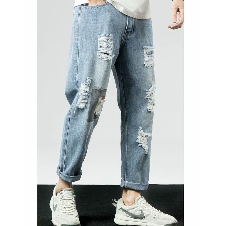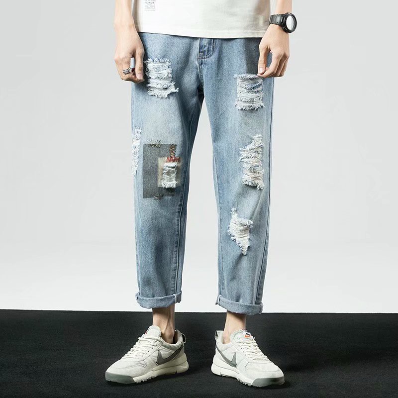 破洞牛仔褲男韓版潮牌寬鬆大碼嘻哈乞丐九分褲子男 牛仔褲 休閒褲 破褲 潮褲(GY9051)【壹號站】