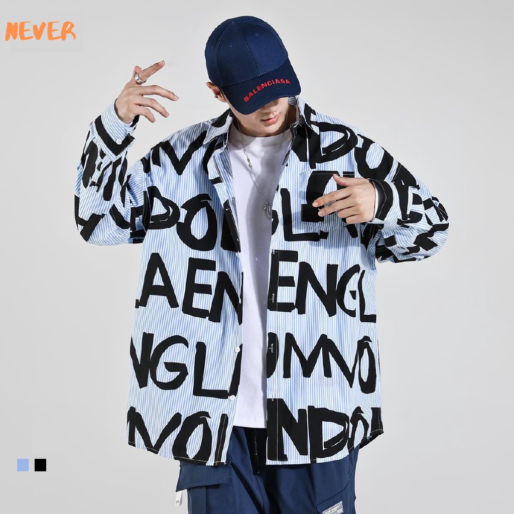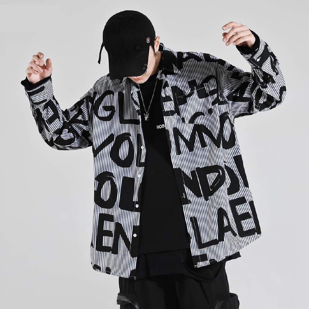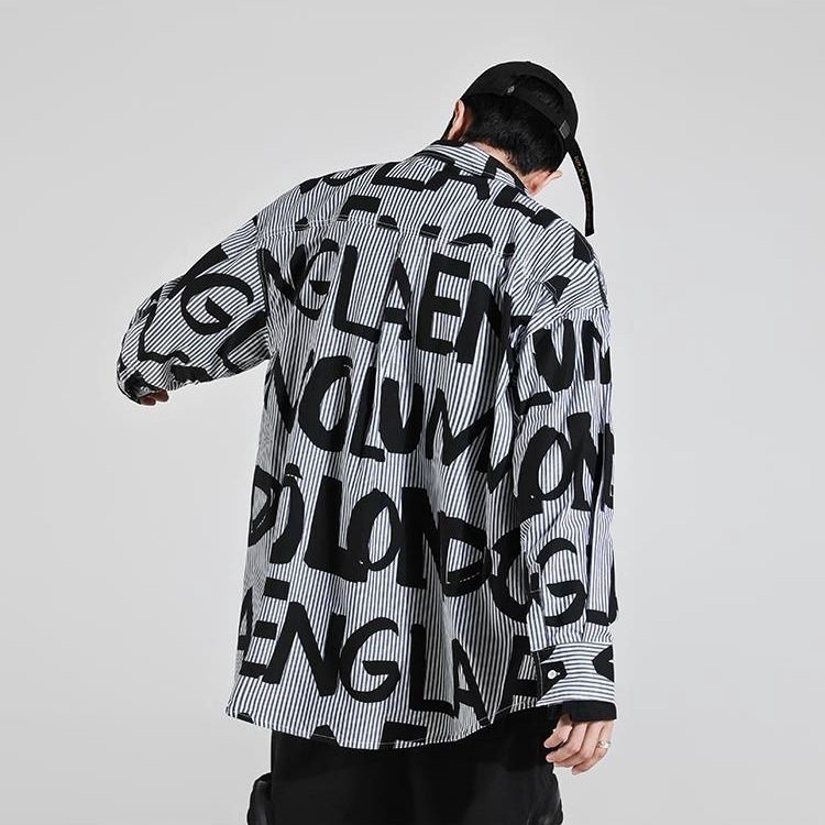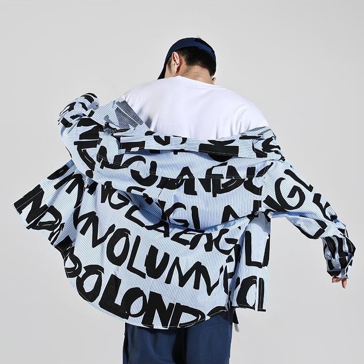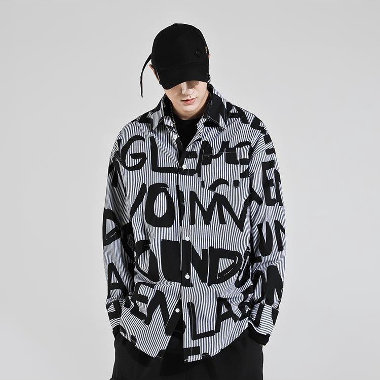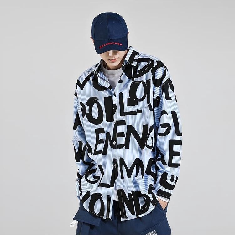 韓版長袖襯衫男 潮牌歐美街頭襯衣 寬鬆全身字母不規則印花襯衫 翻領學生襯衣外套 男生衣著(0017)【壹號站】