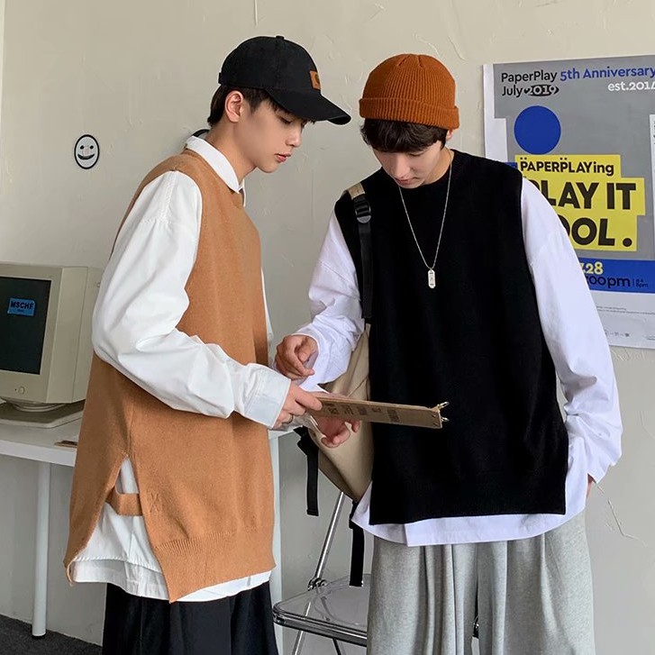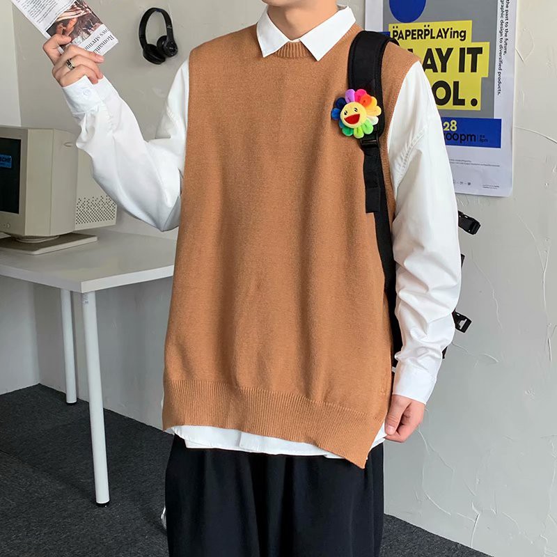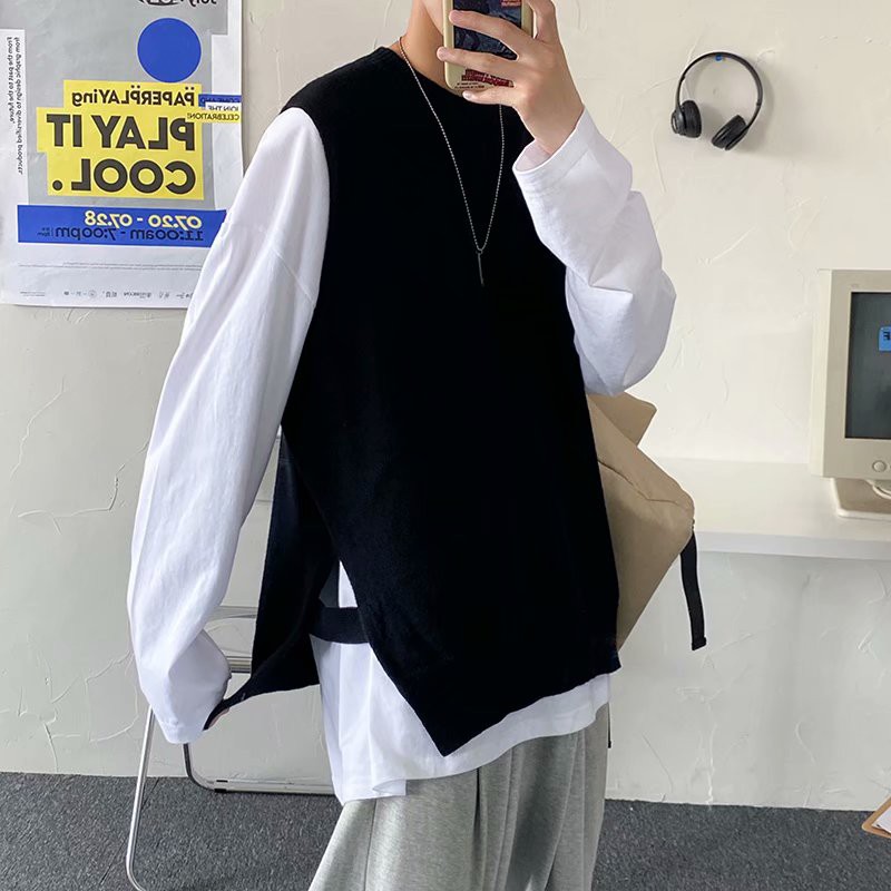 針織衫背心男 無袖V領毛衣 下擺開叉馬甲 學院風韓版潮流港風青年馬甲針織衫 套頭毛衣馬甲(LW625)【壹號站】