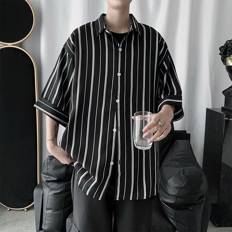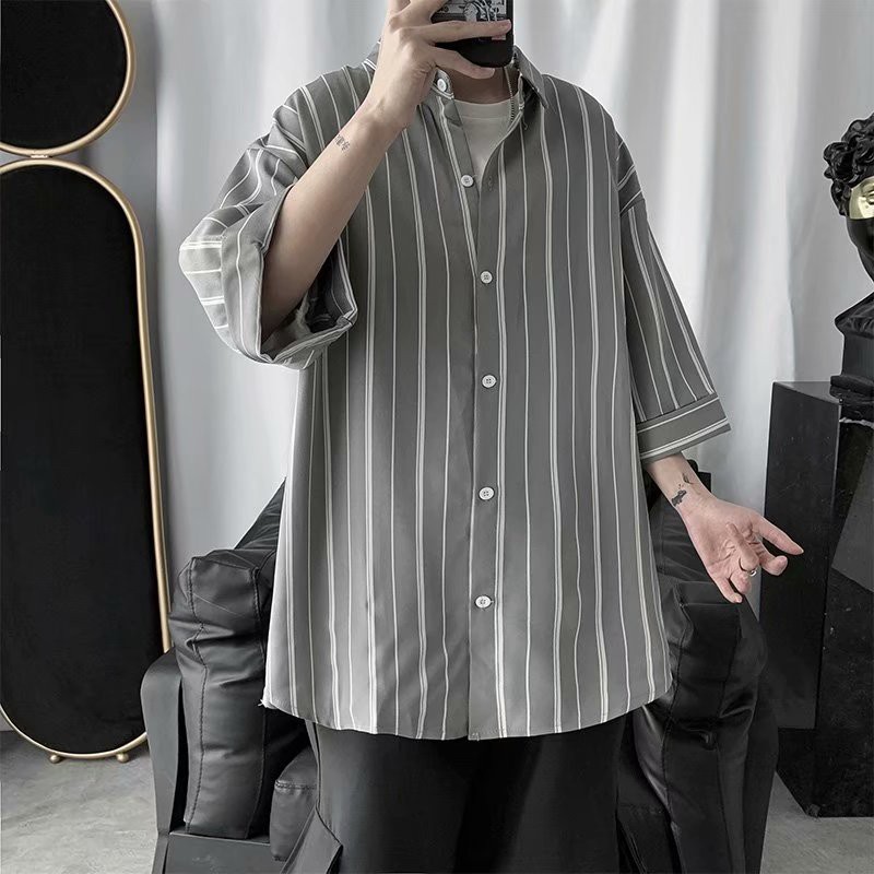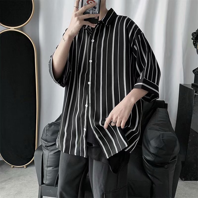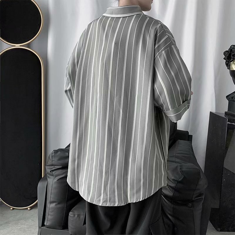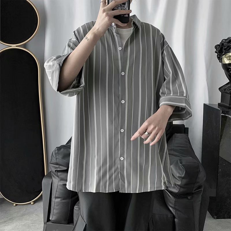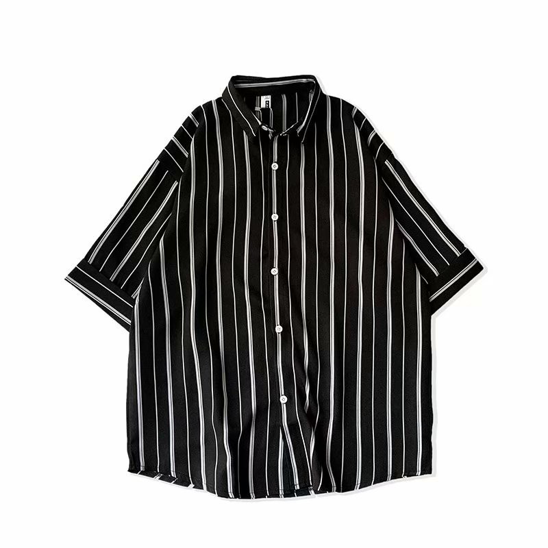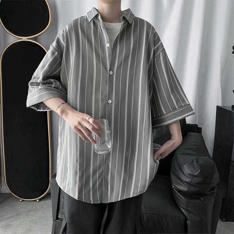 實拍夏季新款韓國時尚條紋寬鬆休閒大碼五分袖襯衫男女情侶裝薄外套 5分袖 襯衫(TFC19)【壹號站】