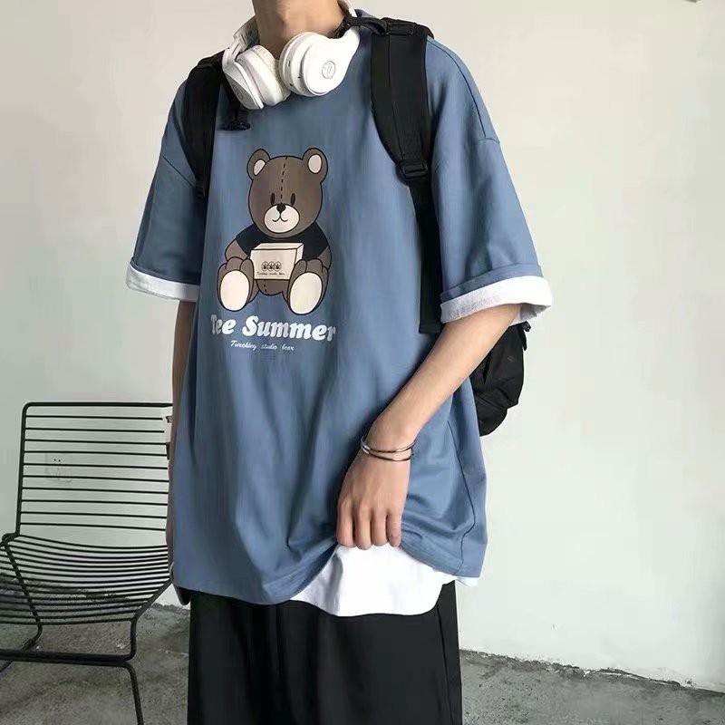 小熊印花T恤 夏季新款 日系 復古 潮牌 短袖 男生T恤 韓版 潮流 學生寬鬆 嘻哈 短袖上衣 短T(CSFC20)