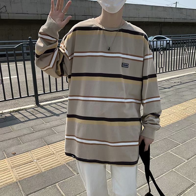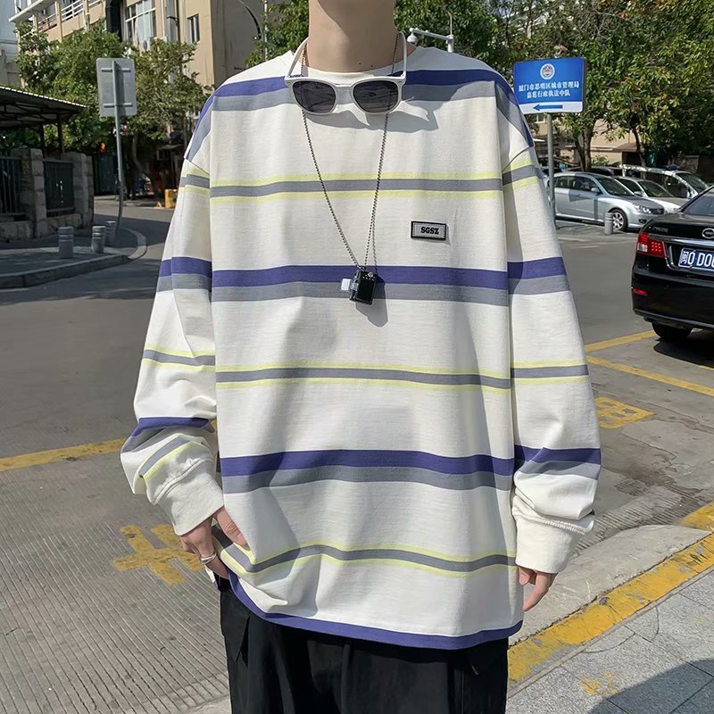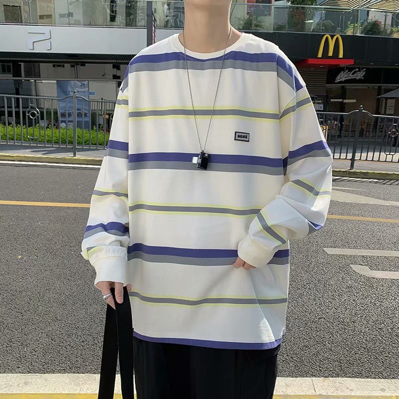 溫柔系穿搭條紋大學T男帥氣潮流外套炸街港風設計感t恤長袖潮牌 大學T 衛衣薄款(TFW23)【壹號站】