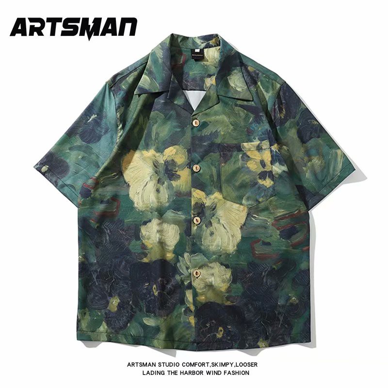 潮流滿版夏威夷花短袖襯衫 vintage花襯衫男冰絲短袖潮流痞帥寬鬆抗皺襯衣 西裝領襯衫(ZDC14)【壹號站】