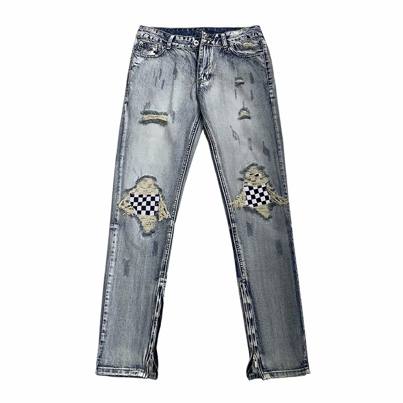新款韓版修身拼接格子破洞牛仔長褲 個性膝蓋破褲 下擺拉鏈 牛仔破褲 潮男修身小腳 牛仔長褲 男(HW3314)【壹號站】