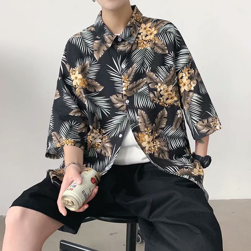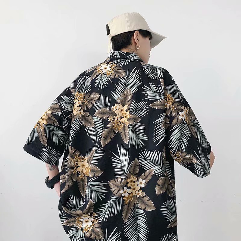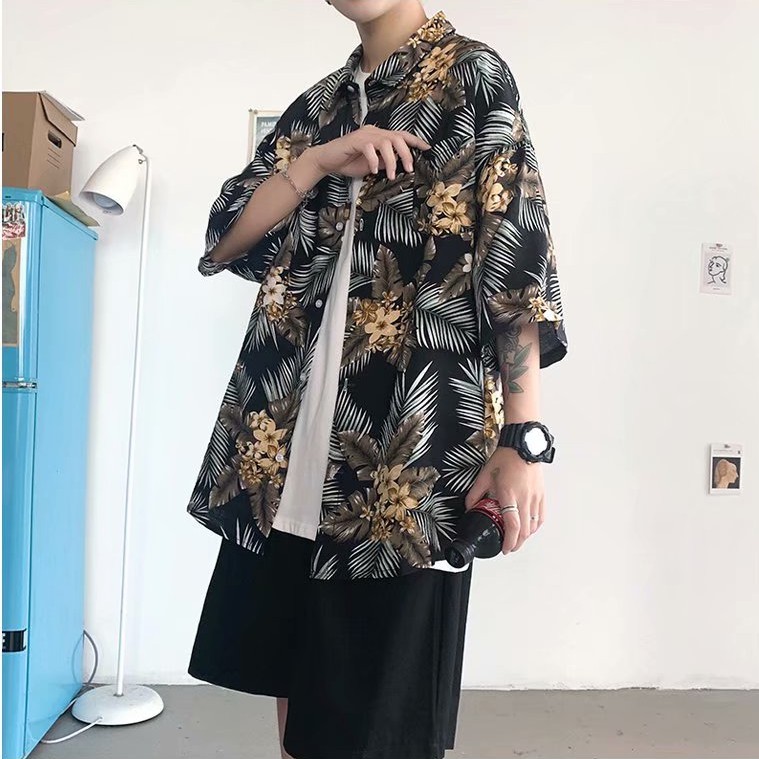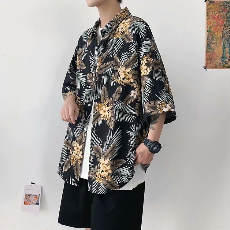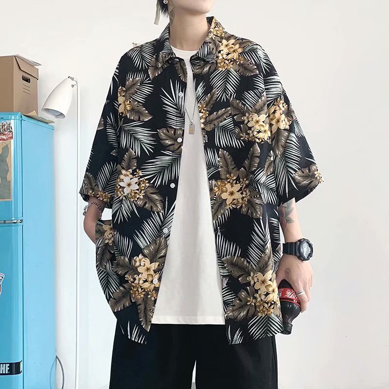 夏威夷度假風短袖 滿版花襯衫不規則 植物花襯衫 花草 短袖 寬鬆襯衫 百搭 滿版 男生衣著 情侶襯衫(JH1106)