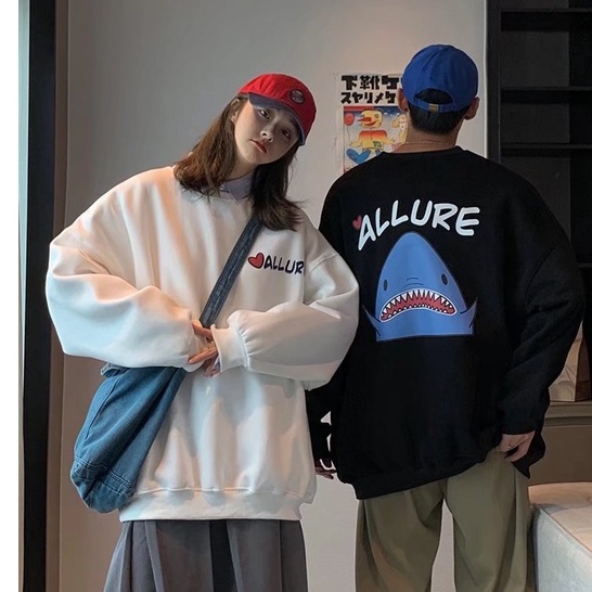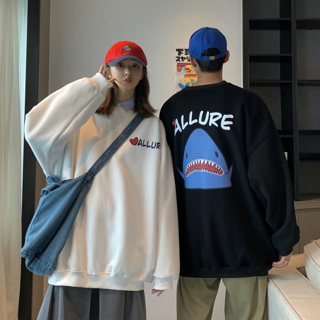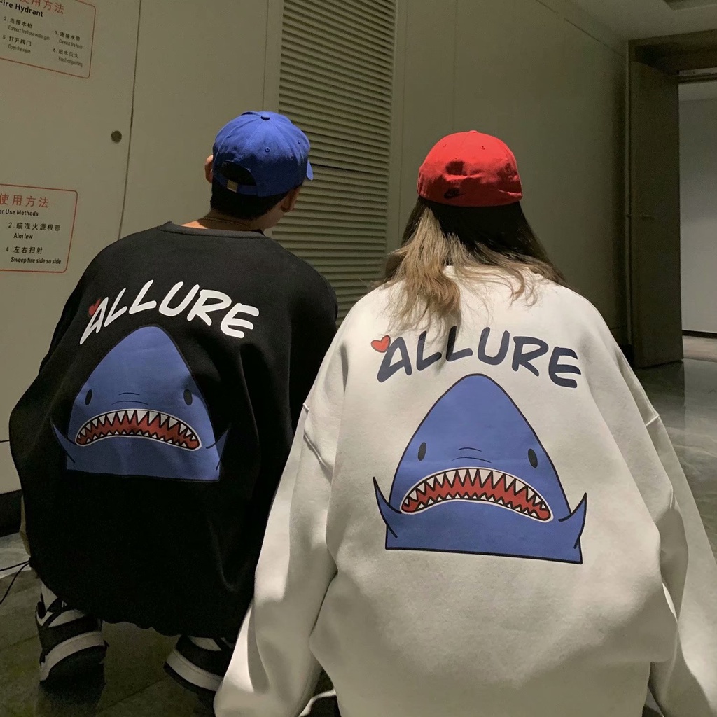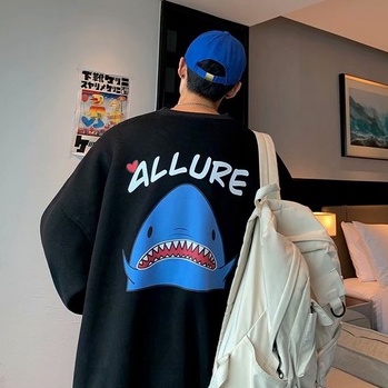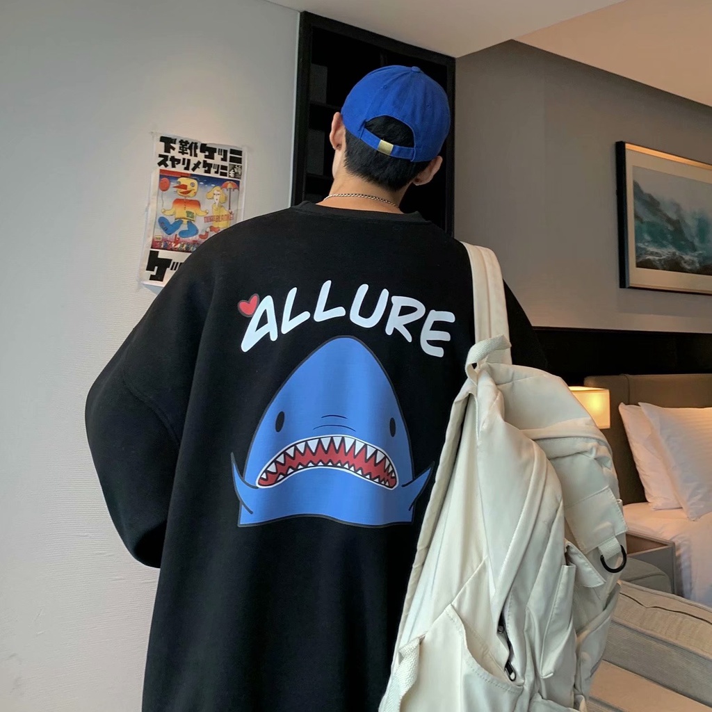 情侶鯊魚印花長袖T恤 薄款衛衣大學T 韓版寬鬆休閒長袖T恤男 男友風 圓領套頭男生長T 長袖上衣(BTK17)【壹號站】