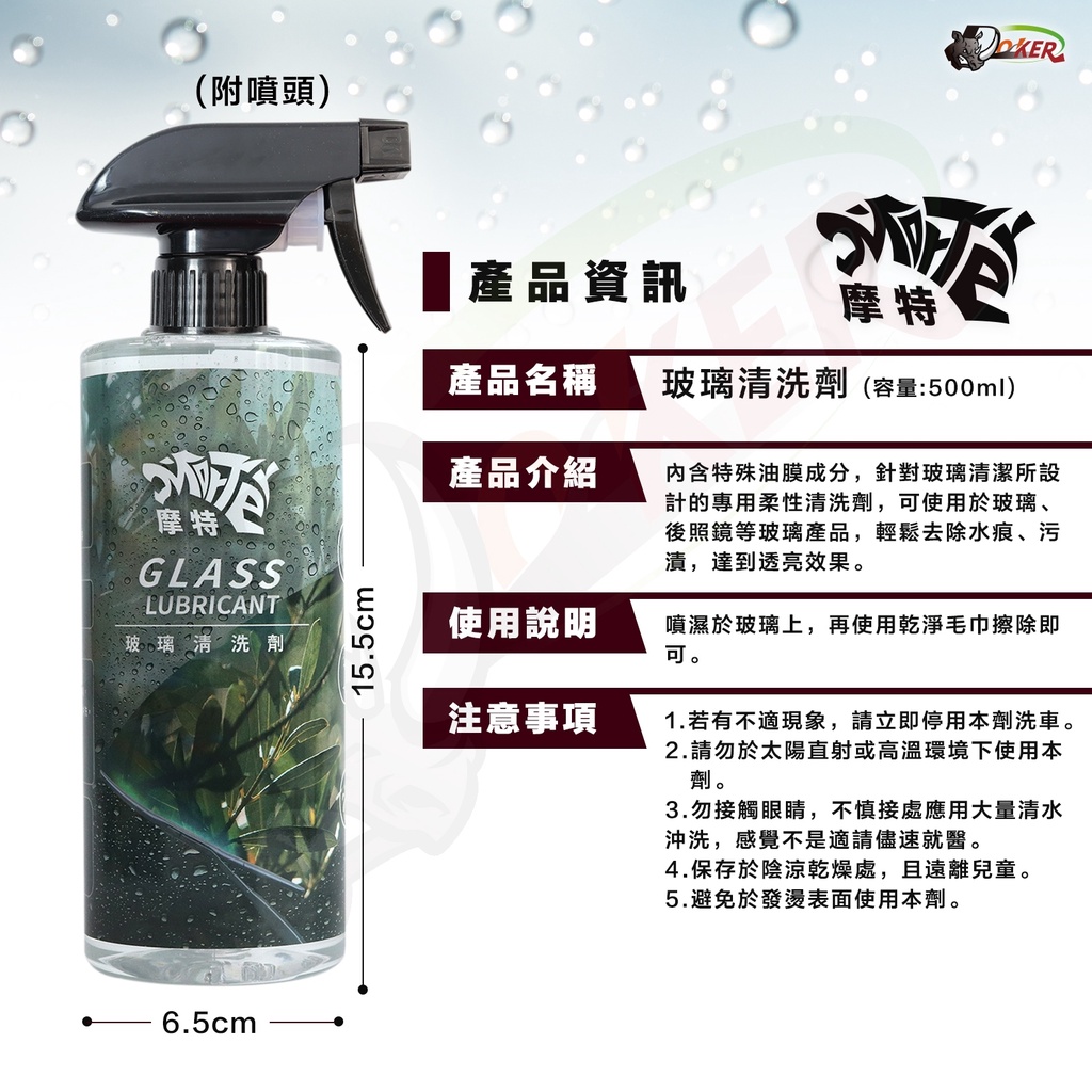 玻璃清潔劑 500ml 透亮 去水痕 去水漬 去油膜 雨刷精 清潔劑 汽車美容 輪框清潔 鍍客doker 摩特