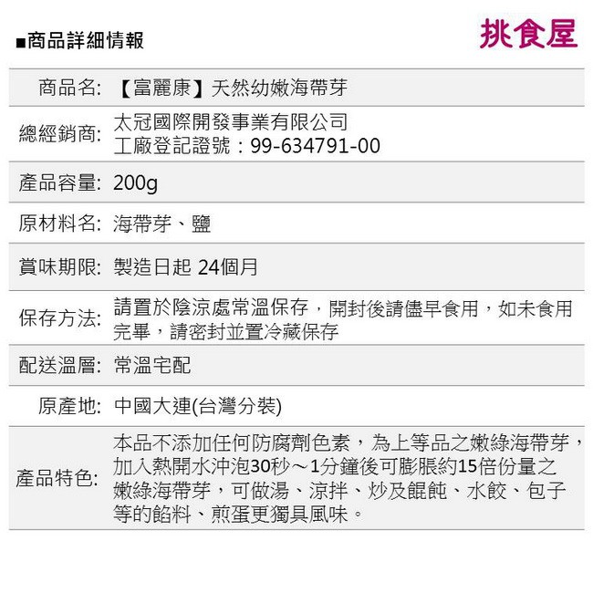 【富麗康】天然乾燥幼嫩海帶芽 15倍擴大 200g 挑食屋