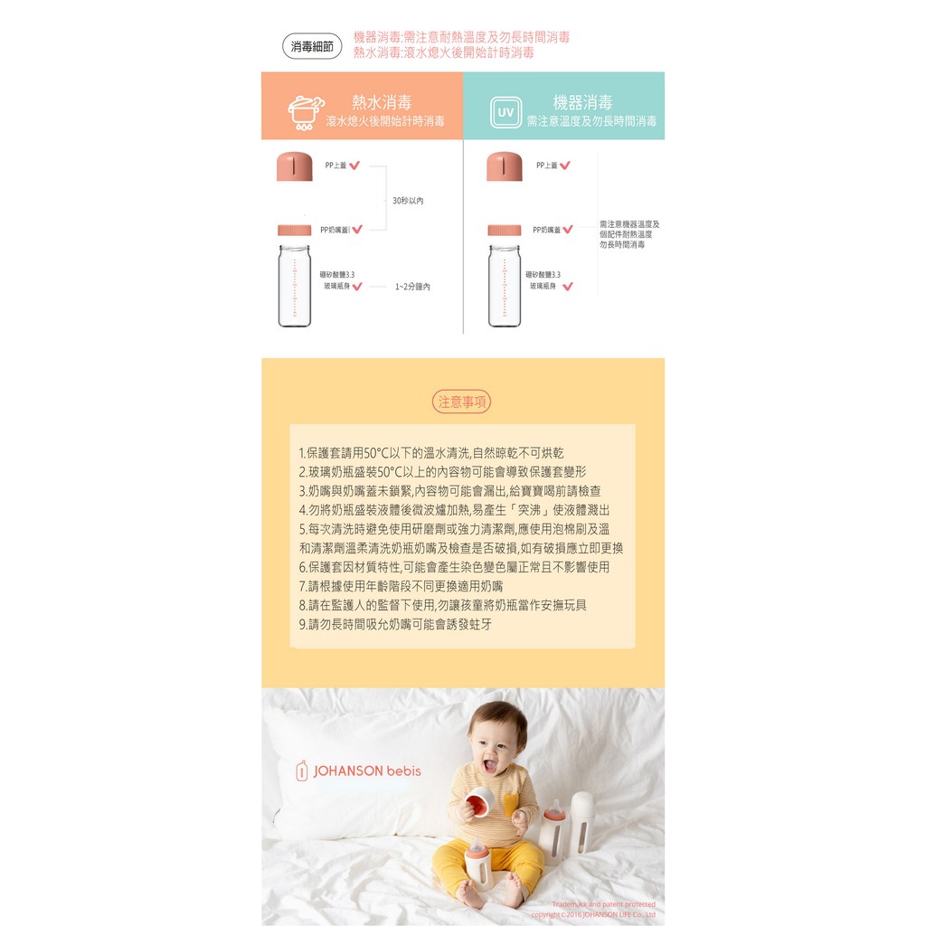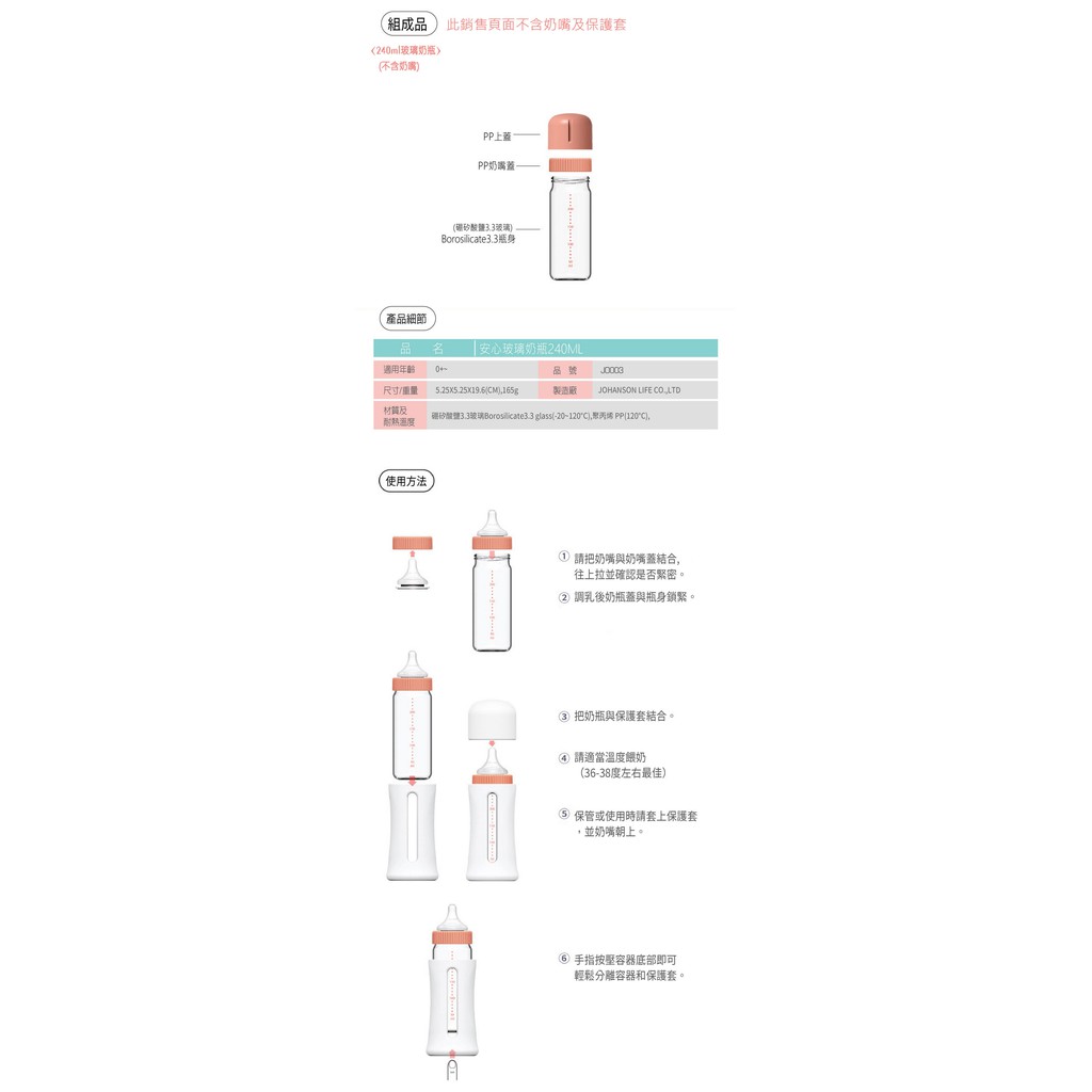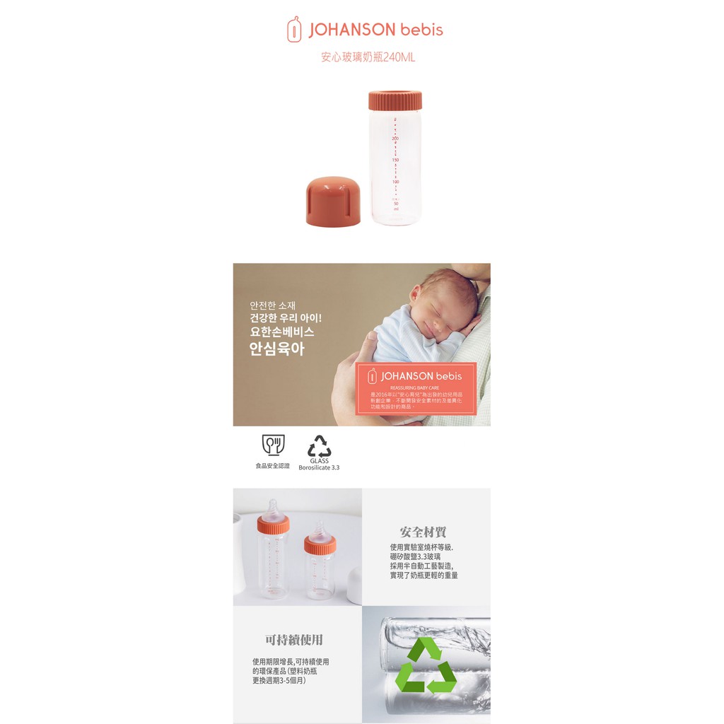 【韓國JOHANSON】安心玻璃奶瓶240ML(高品質玻璃奶瓶 可替換其他寬口徑奶嘴)