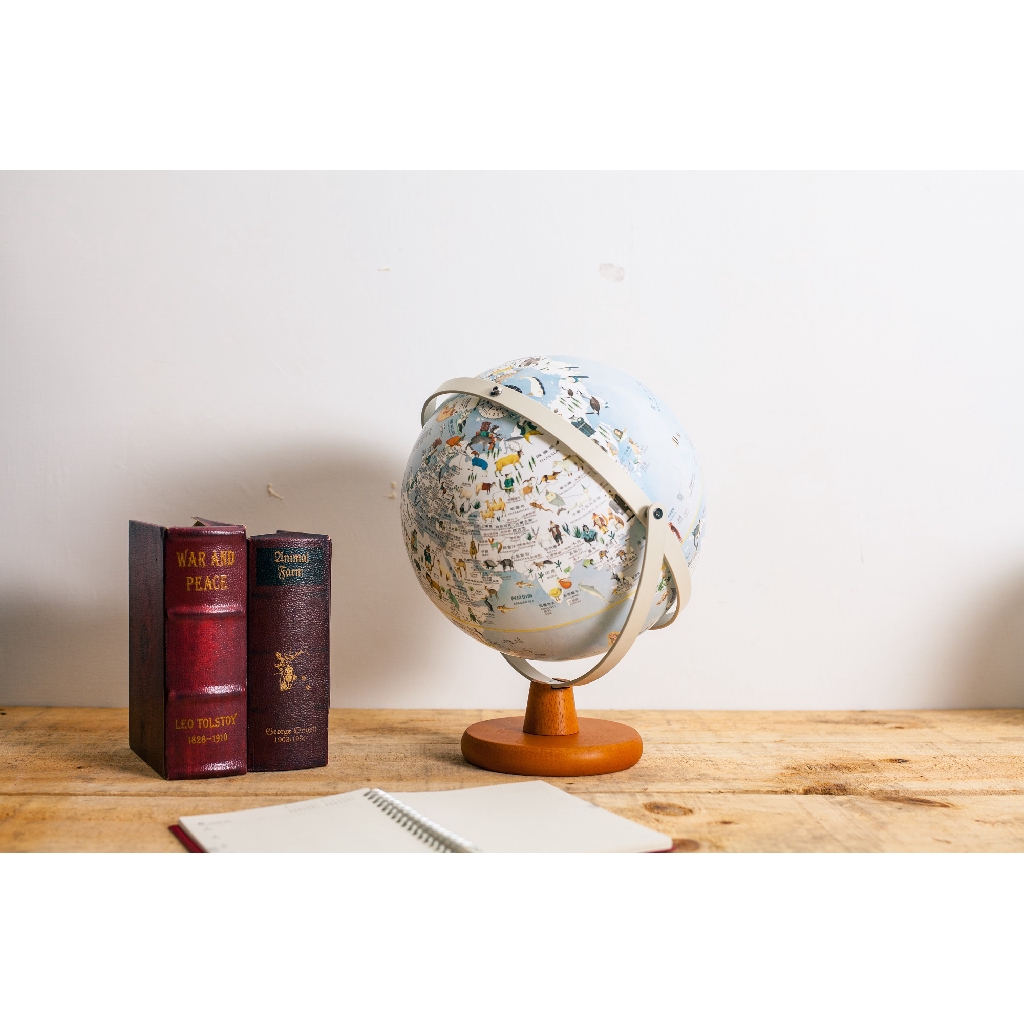 茂意興-10吋新動物版全圓烤米黃木座地球儀(MS-21182A5ABB-CY360度旋轉全中文
