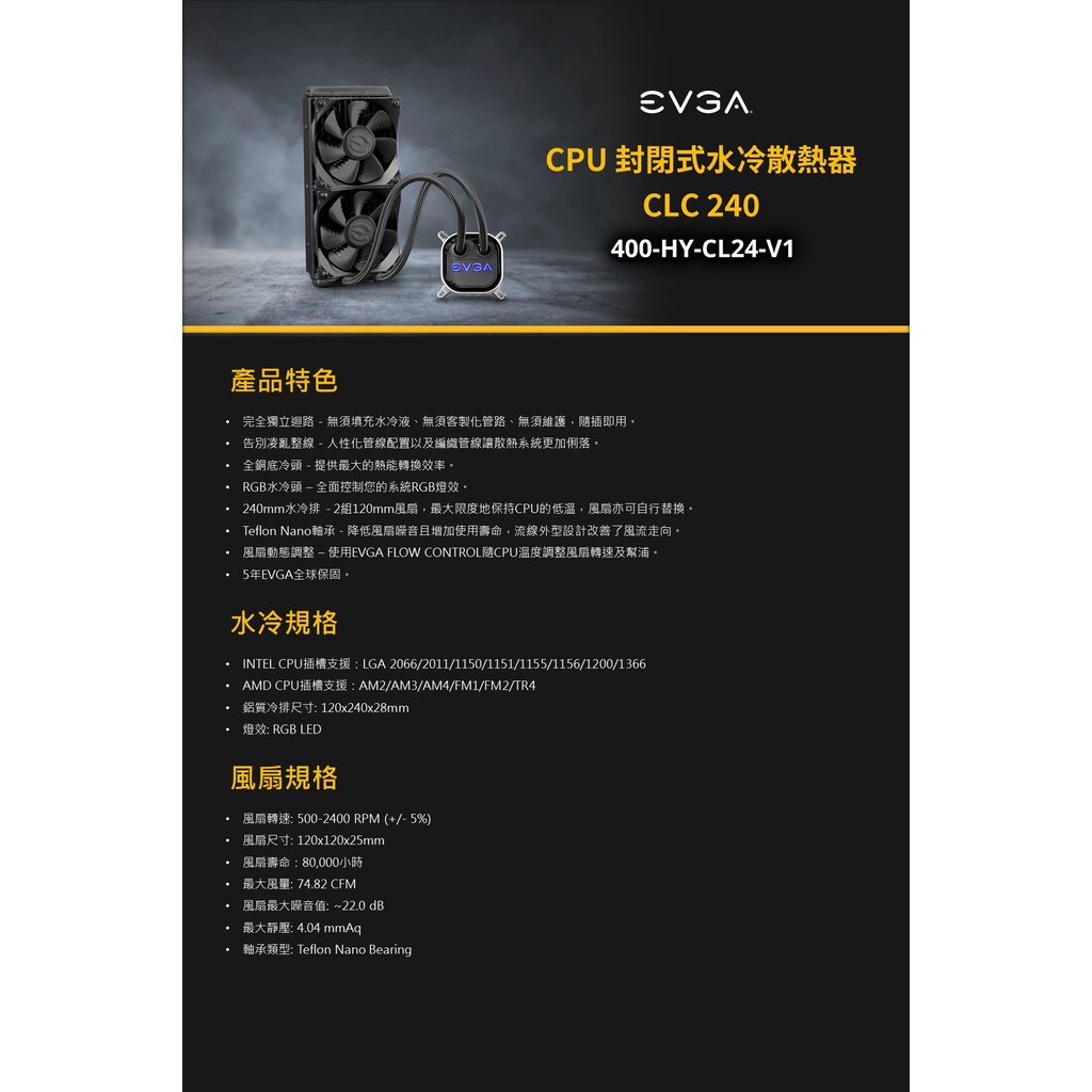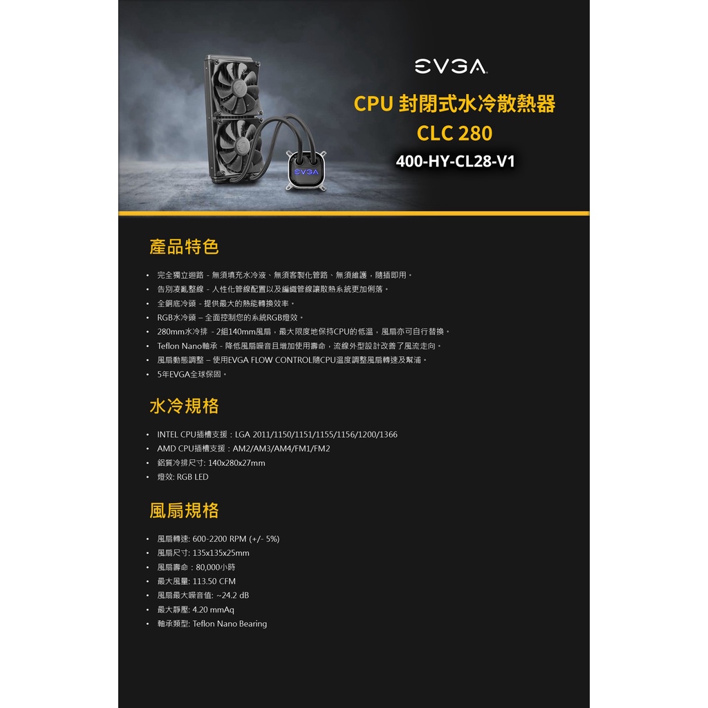 EVGA 艾維克 CLC 240 280 LGA1700 AM4 AM5 一體式 水冷 CPU 散熱器 風扇
