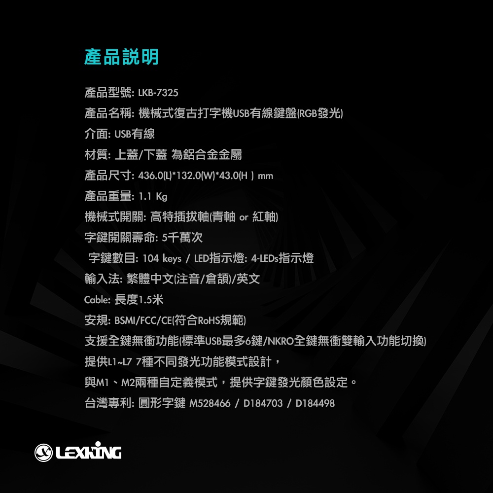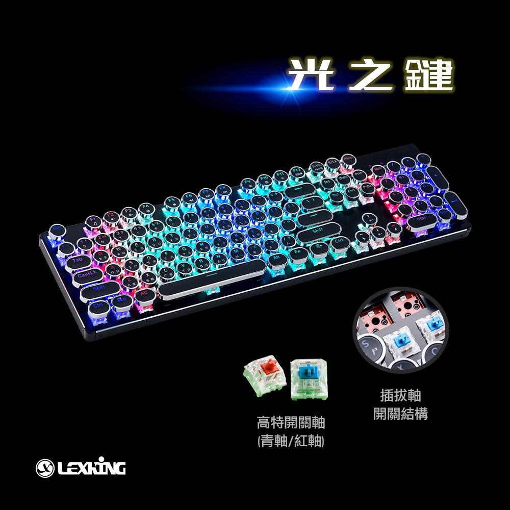 Lexking 雷斯特 LKB-7325 光之鍵 RGB 機械式 復古式 打字機 蒸汽龐克 鍵盤 中英文 青軸 紅軸