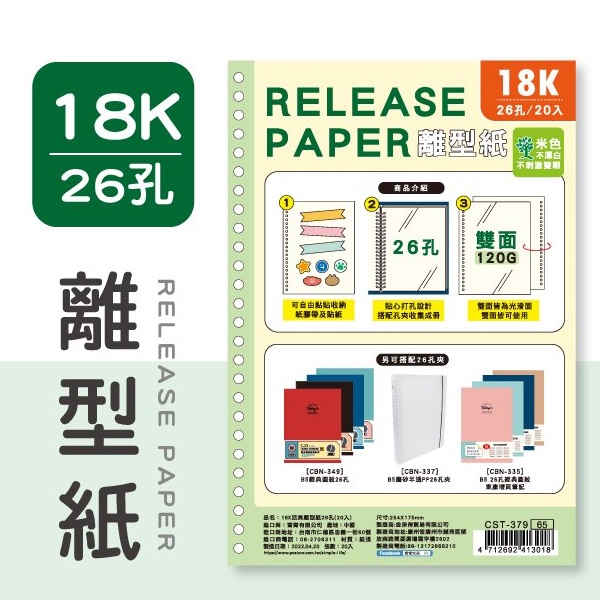 活頁離型紙18K(26孔)/25K(6孔)離型紙 貼紙收集 紙膠帶收集CST-378/CST-37 【久大文具】0188