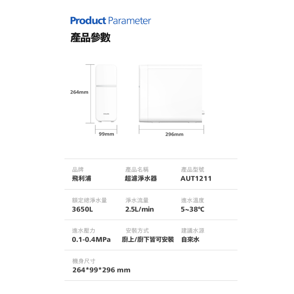 官方專售 直接生飲等級 好安裝免插電【PHILIPS飛利浦】生飲級免插電櫥上/櫥下兩用型超濾淨水器 AUT1211