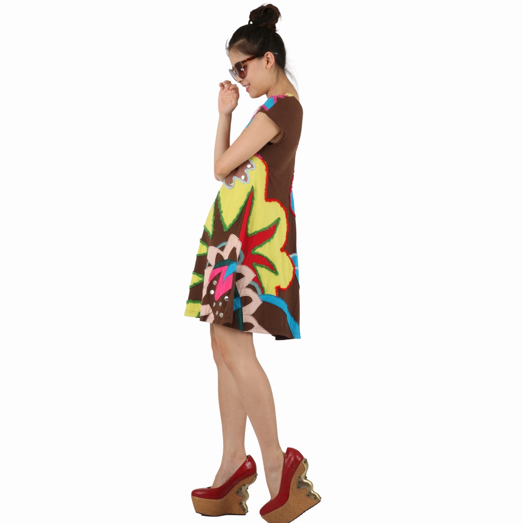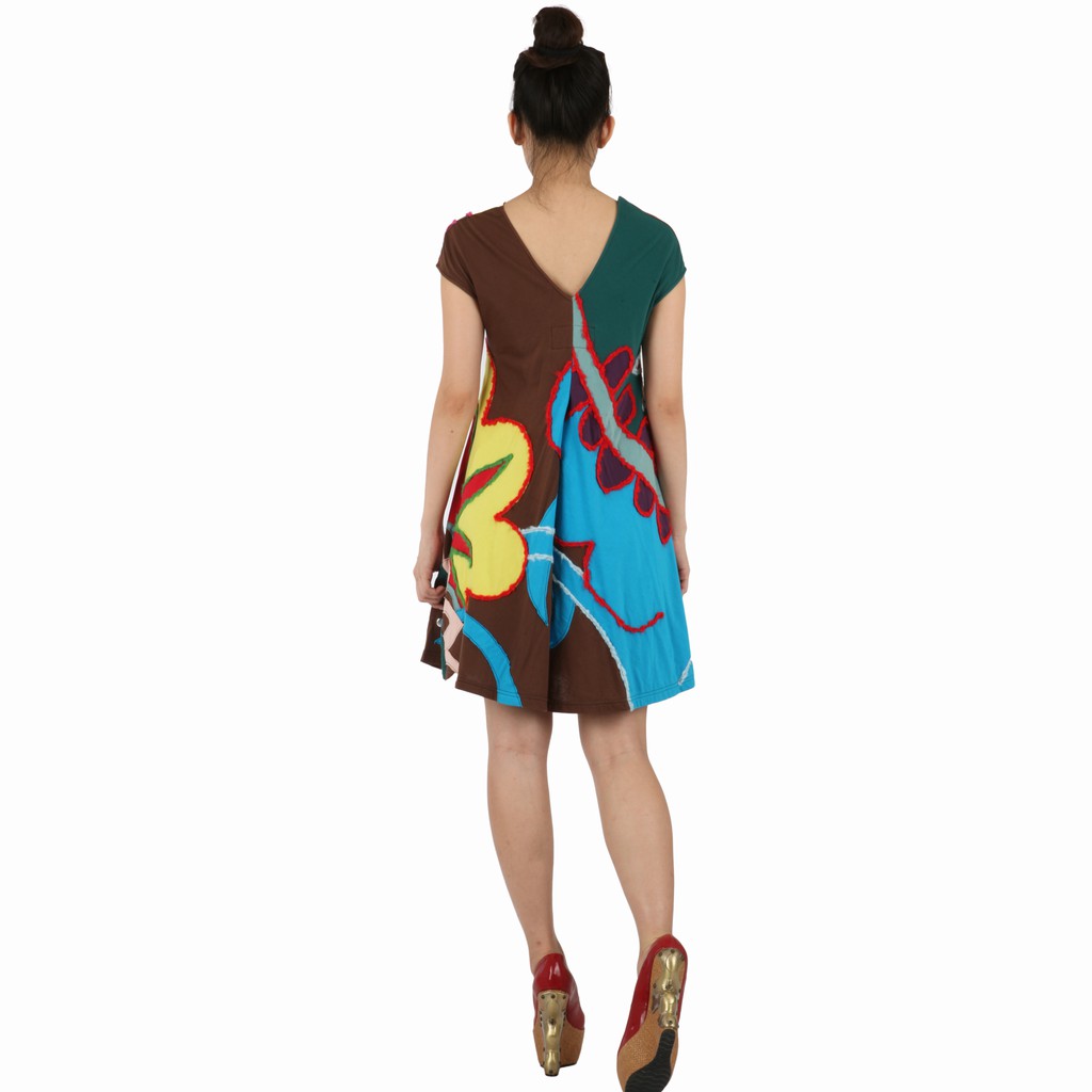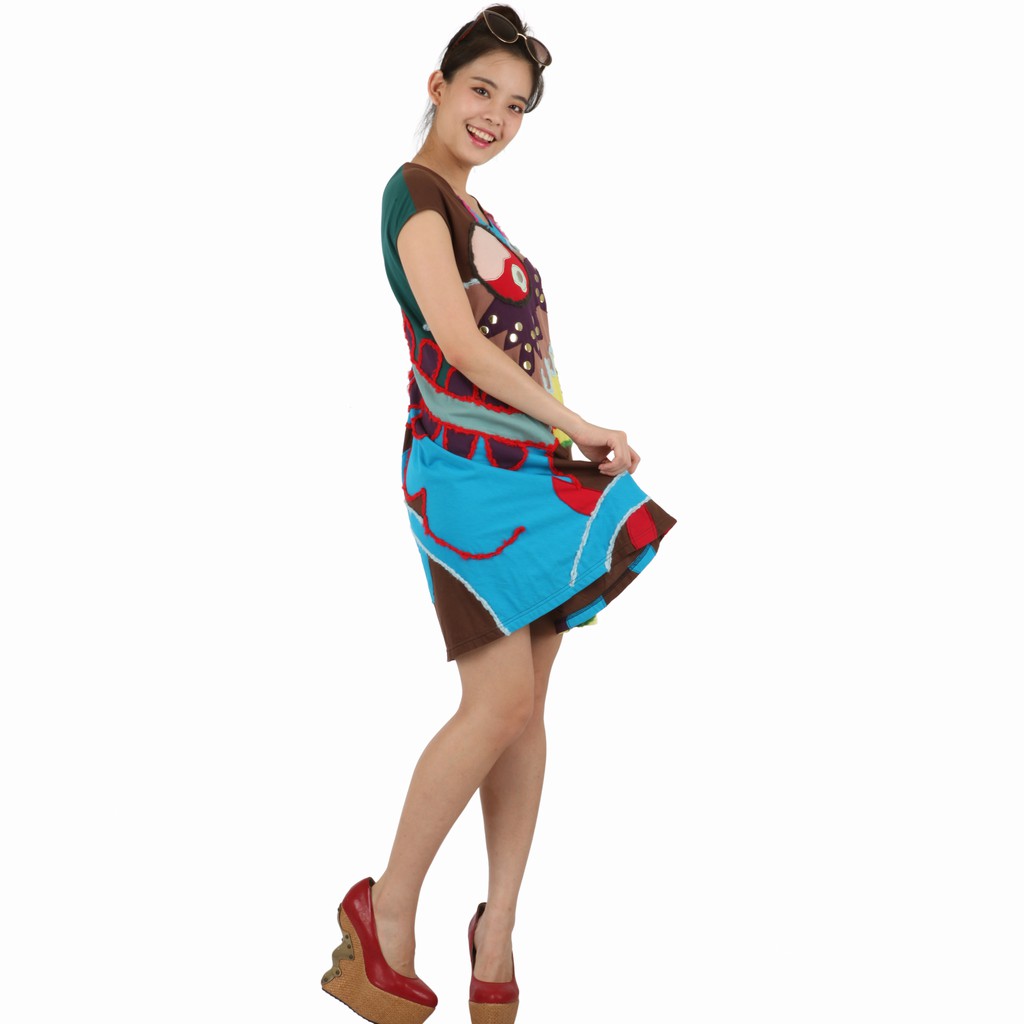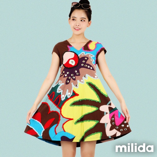 milida 純棉女版洋裝 大A裙襬 海底世界抽象拼貼 V領設計金屬亮片混搭造型洋裝 MR10P019