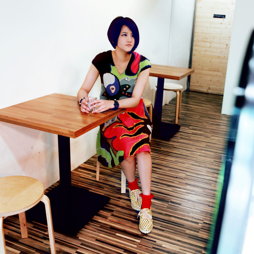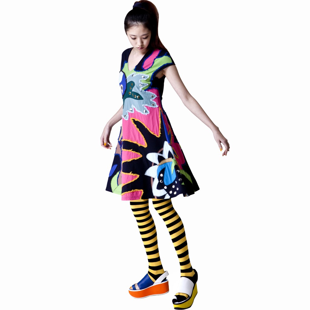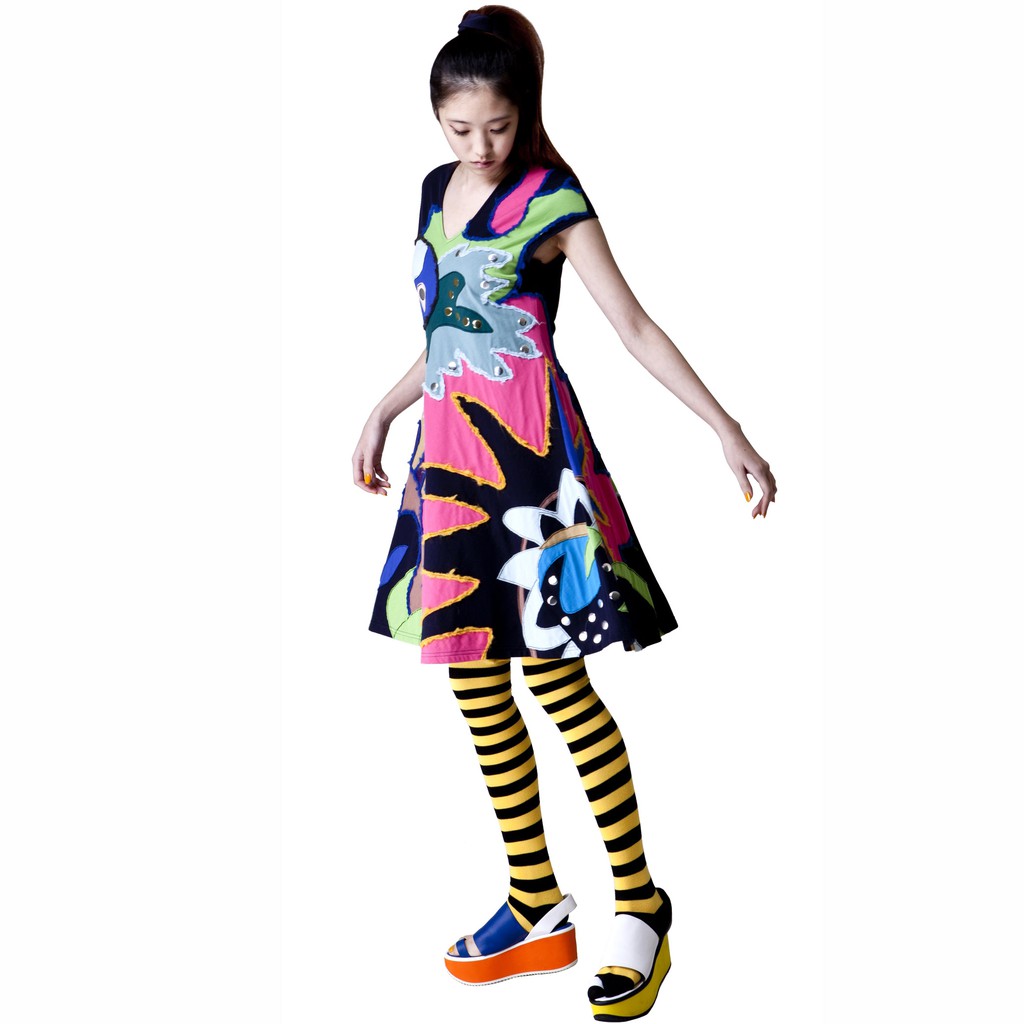 milida 純棉女版洋裝 大A裙襬 海底世界抽象拼貼 V領設計金屬亮片混搭造型洋裝 MR10P019