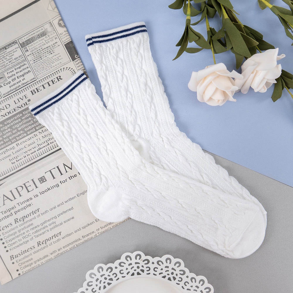 AUHA阿華有事嗎 韓國襪子 雙條紋襪口立體麻花紋中筒襪【K1259】條紋 少女襪 百搭純棉襪