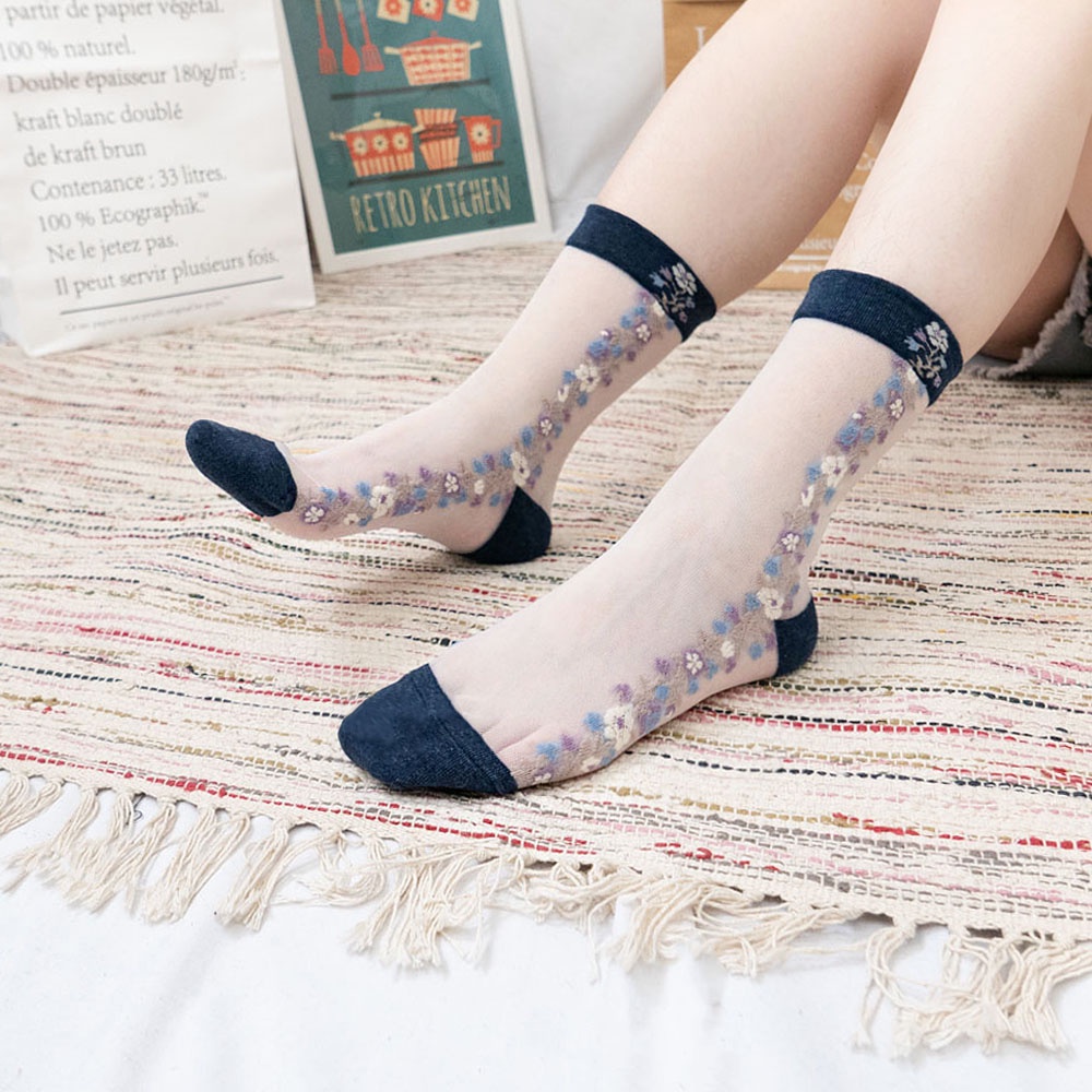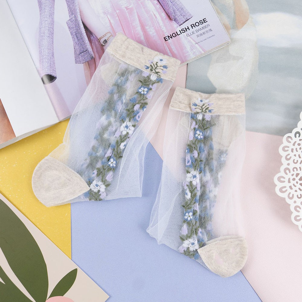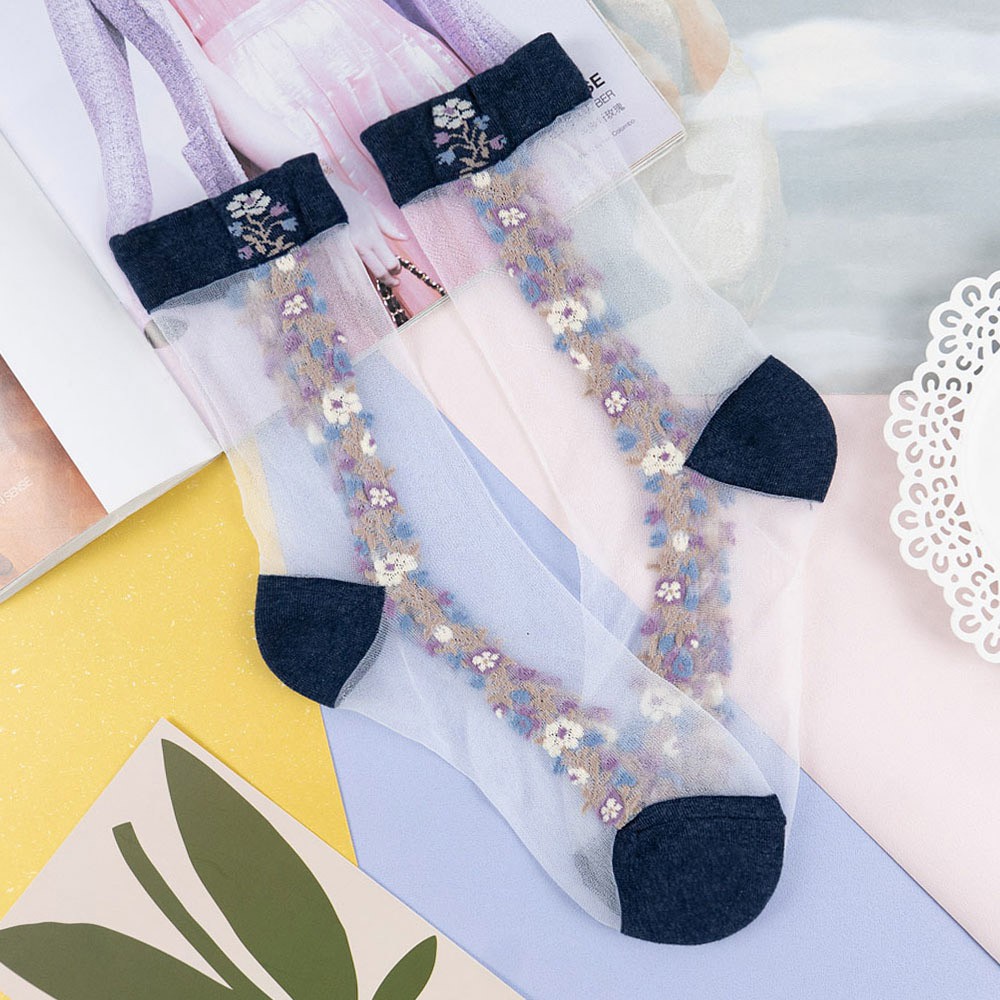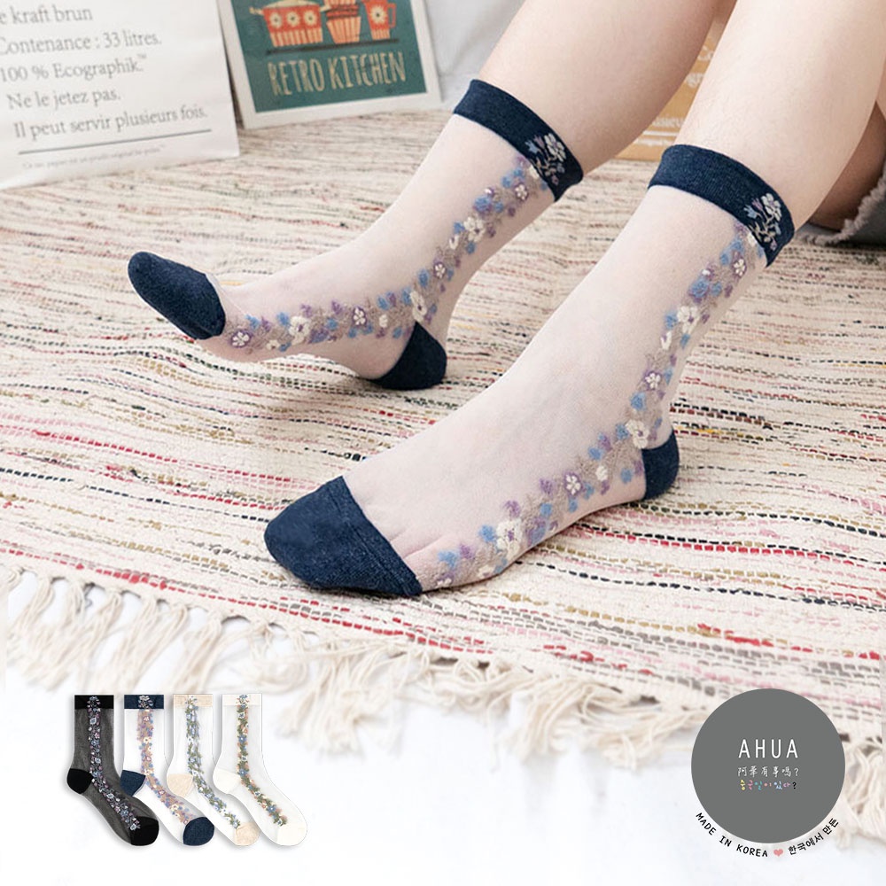 阿華有事嗎AUHA 韓國襪子 透膚側邊直條碎花中筒襪【K1125】少女襪 韓妞必備長襪 百搭純棉襪