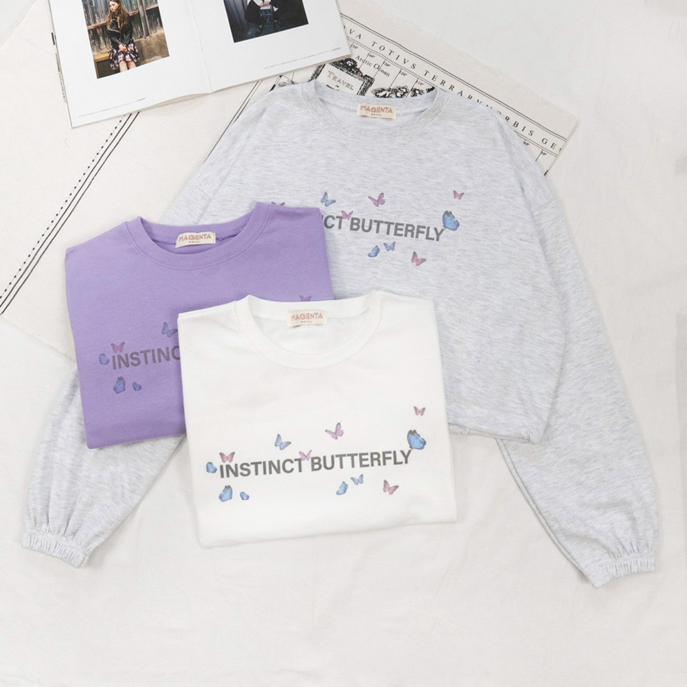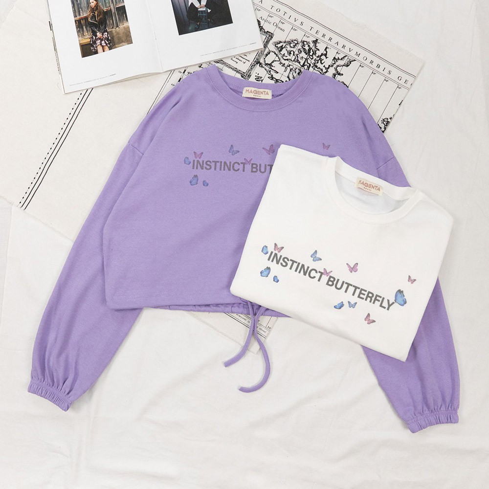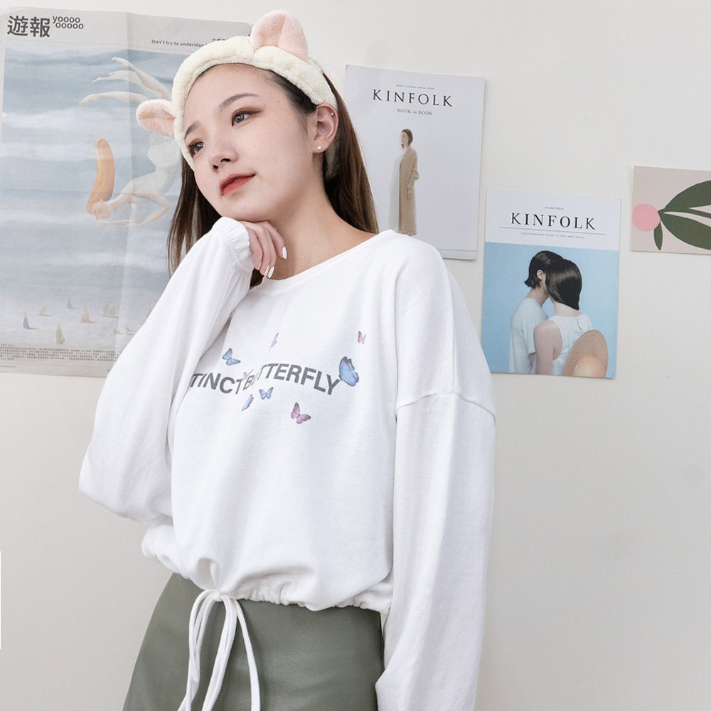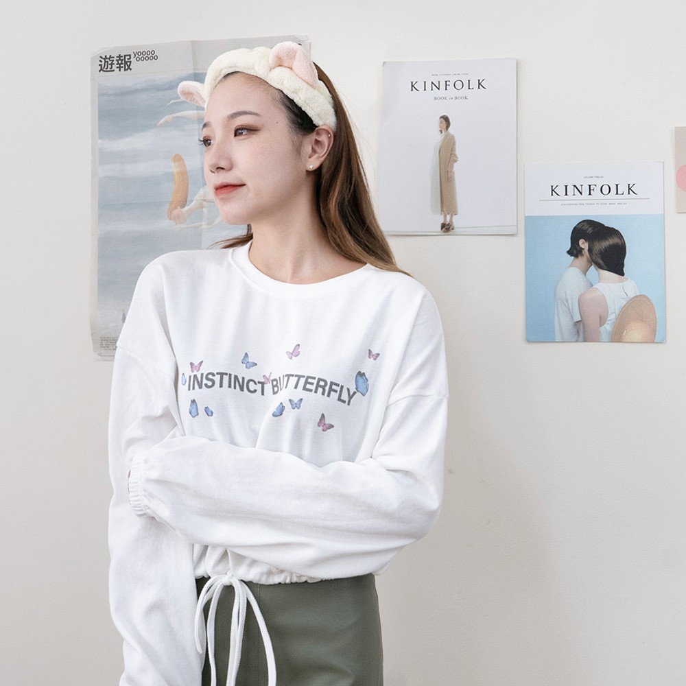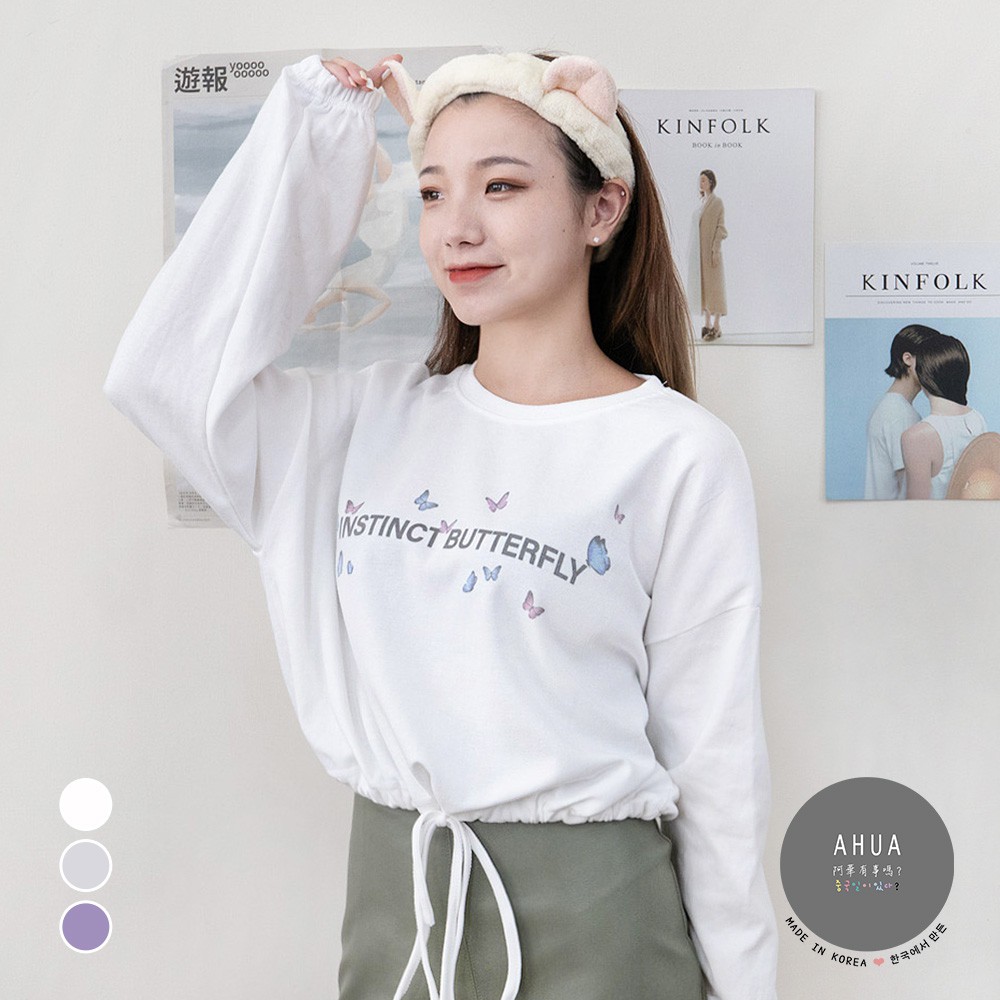 AHUA阿華有事嗎 韓國女裝 下擺抽繩字母蝴蝶短版長袖上衣【C2169】韓妞必備 百搭基本款