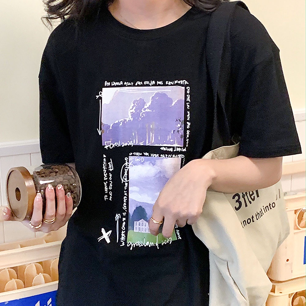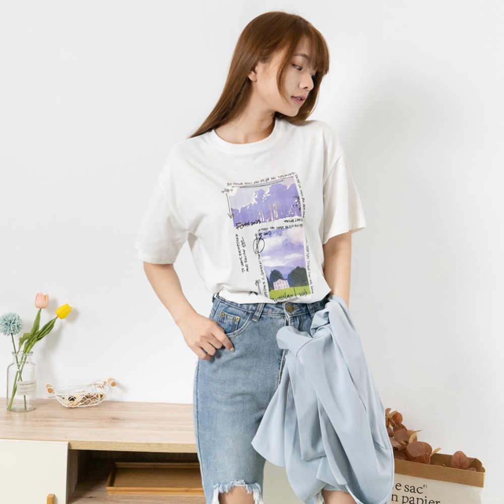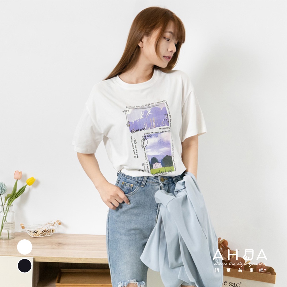 AHUA阿華有事嗎 韓系女裝 字母風景圖案短袖T恤【C2362】休閒 寬鬆 印花 短袖上衣 T恤 顯瘦 百搭 基本款