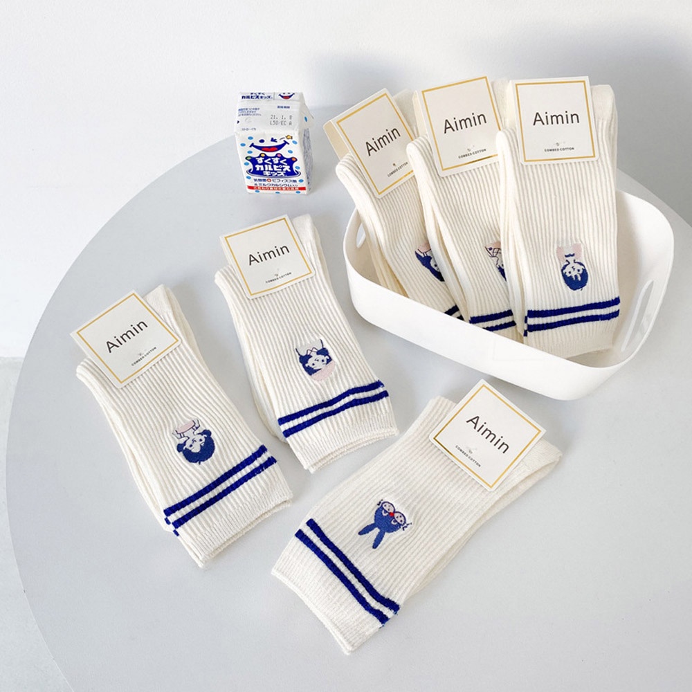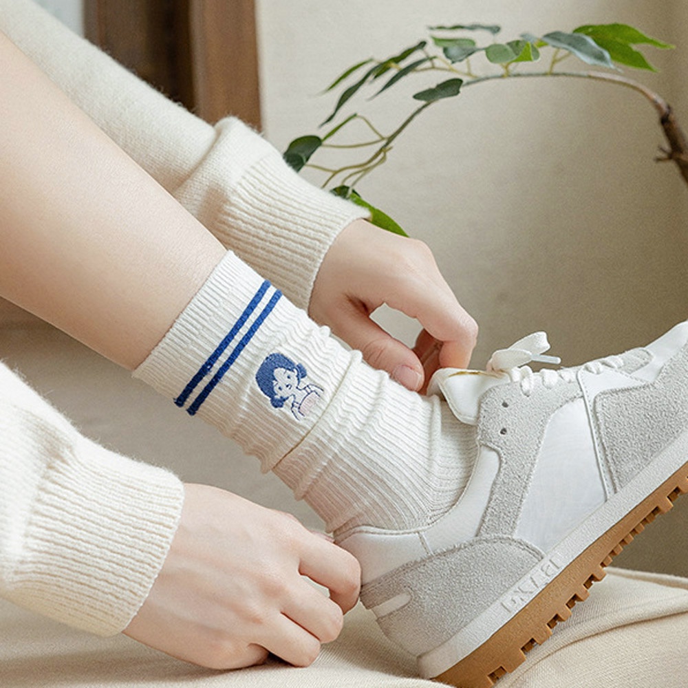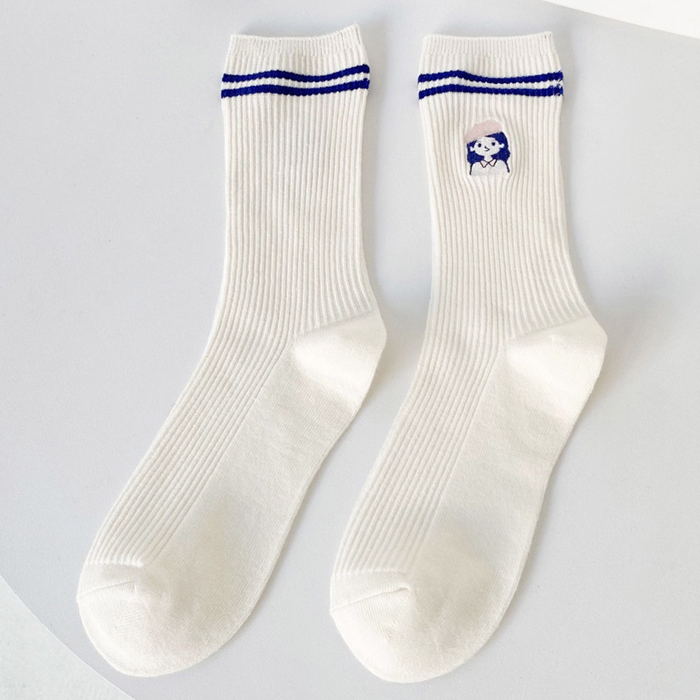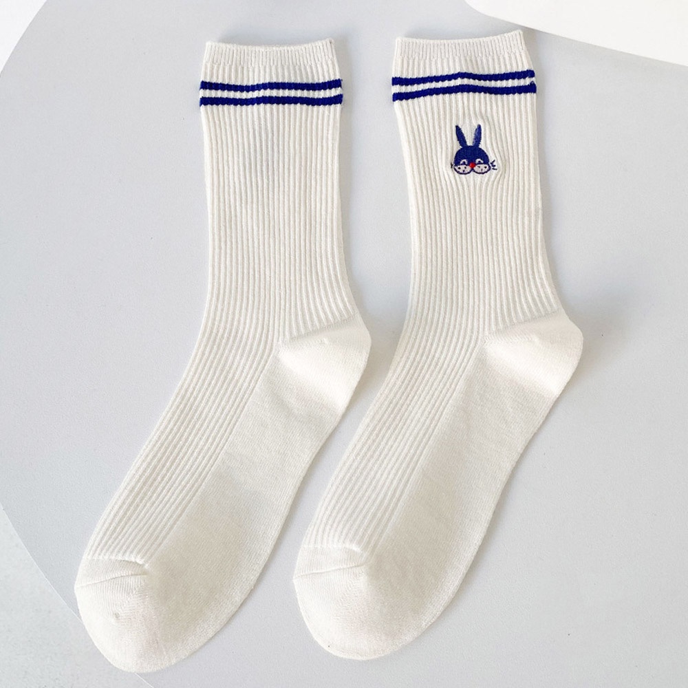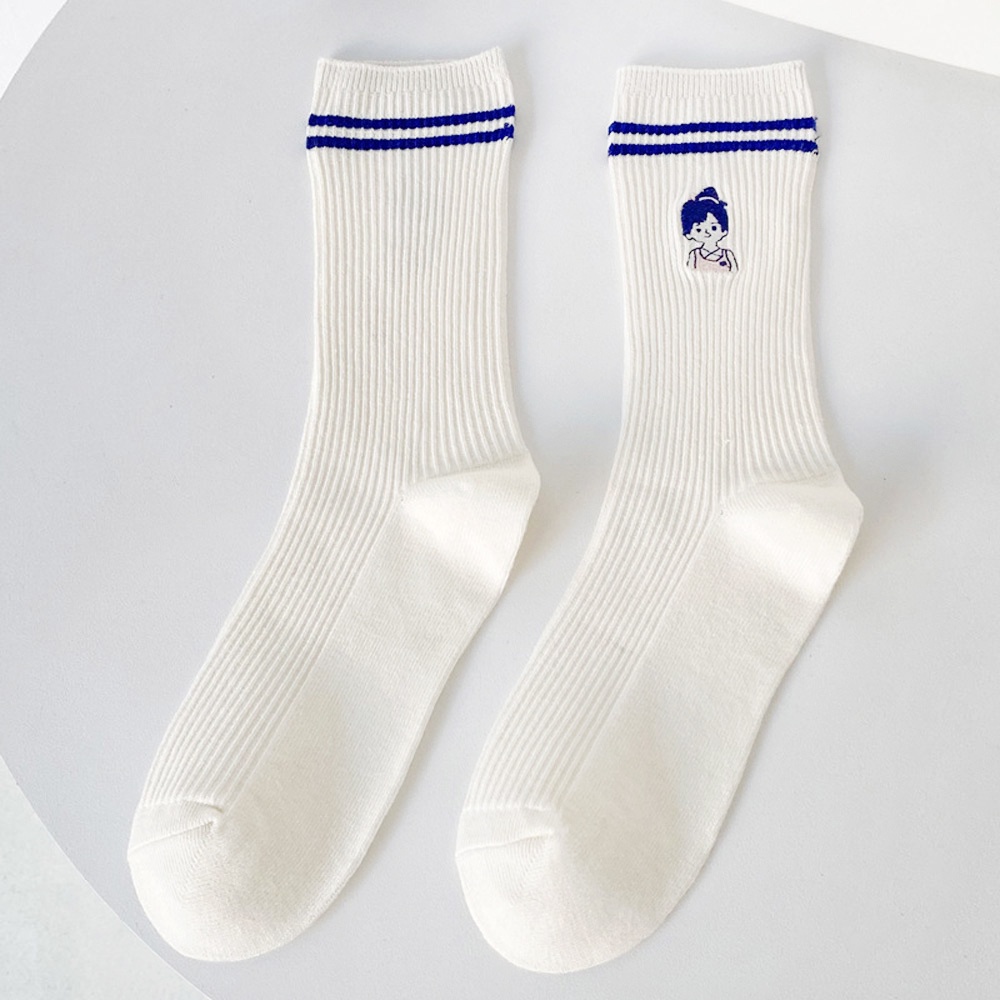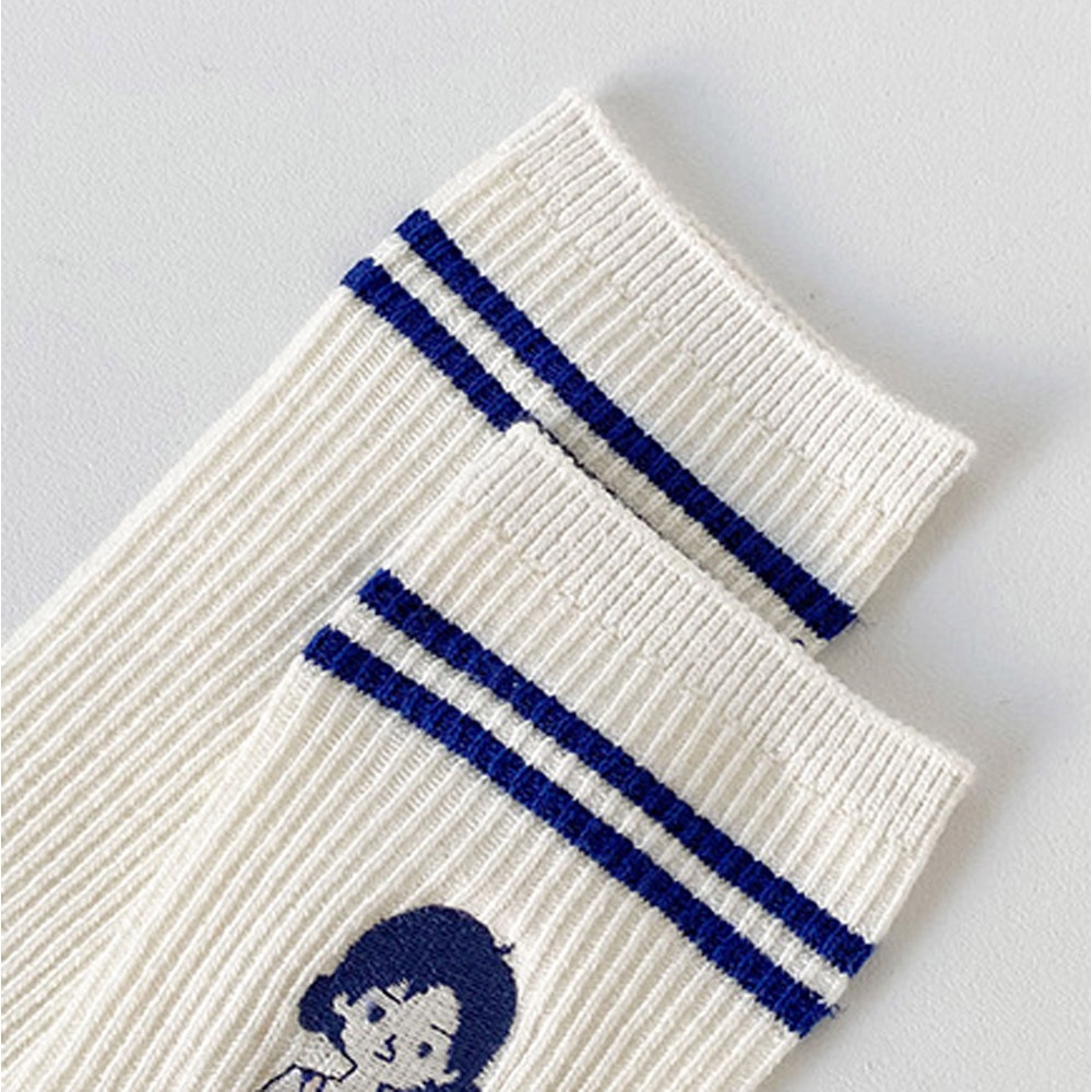 AUHA阿華有事嗎 日系襪子 克萊因藍雙條紋刺繡小圖堆堆襪【S0420】可愛 女襪 百搭純棉襪