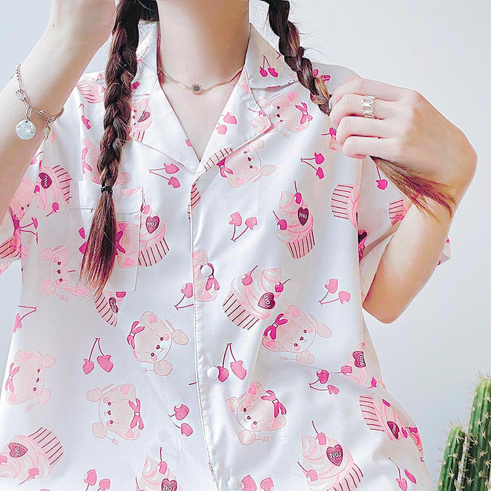AHUA阿華有事嗎 韓系女裝 熊熊杯子蛋糕短袖套裝居家服 睡衣【C2049】家居服 韓妞必備 百搭基本款