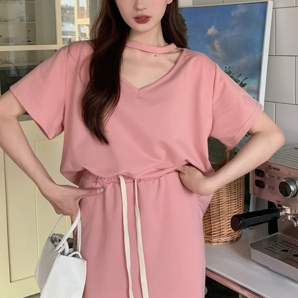 AHUA阿華有事嗎 韓系女裝 V領開岔休閒套裝【C2557】繞頸 短袖套裝 裙子 氣質 百搭 韓妞必備 休閒
