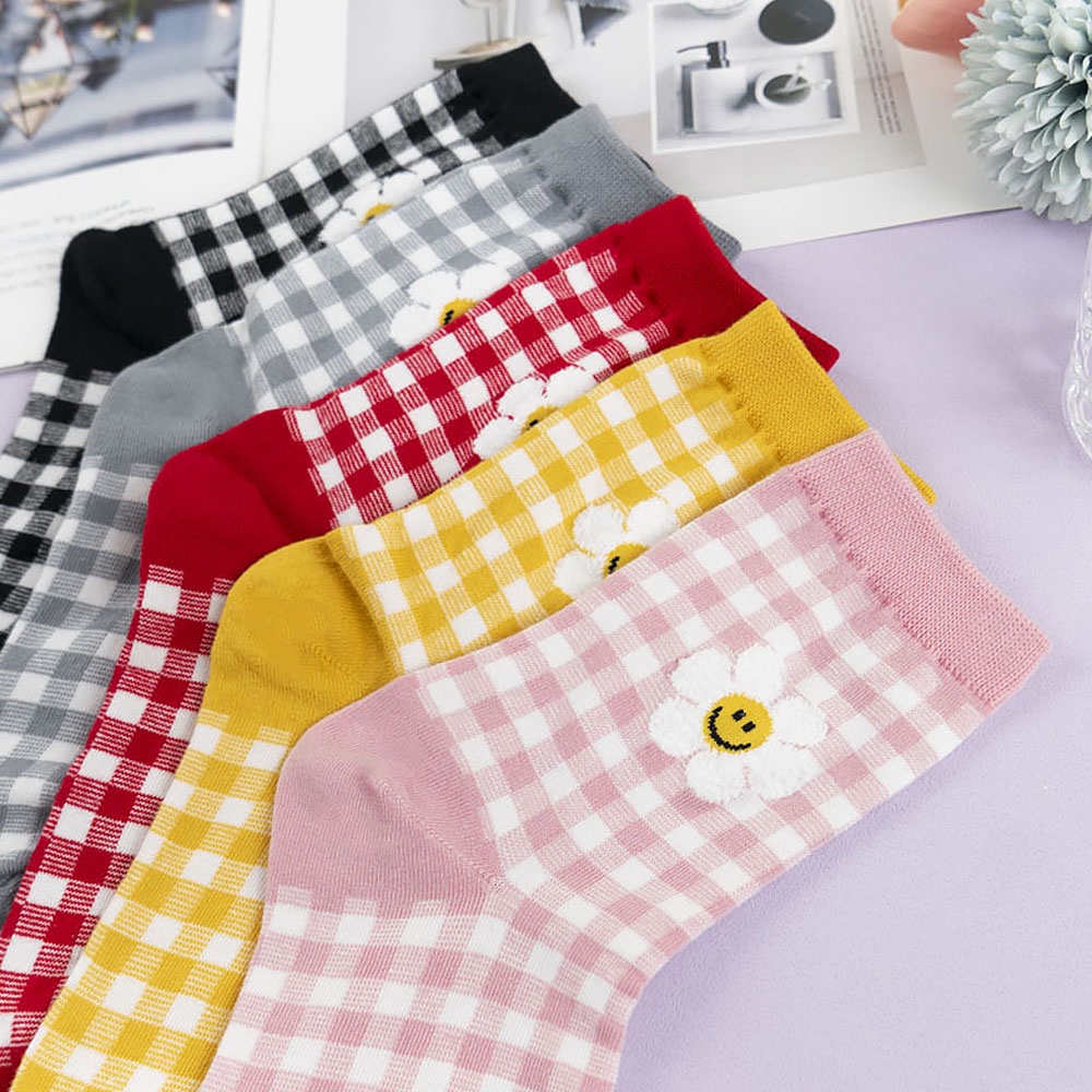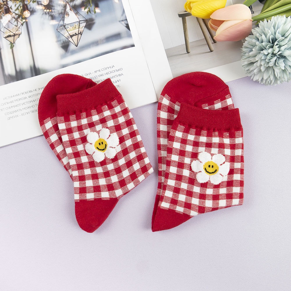 AUHA阿華有事嗎 韓國襪子 毛毛微笑花朵格紋中筒襪【K1450】百搭 可愛 女襪 中筒純棉襪