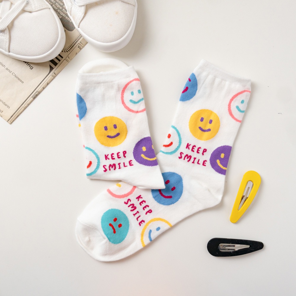 AHUA 韓國襪子 滿版彩色笑臉中筒襪 女生襪子 女襪 笑臉襪子 正韓襪子 襪子推薦 純棉襪子 K1808 阿華有事嗎