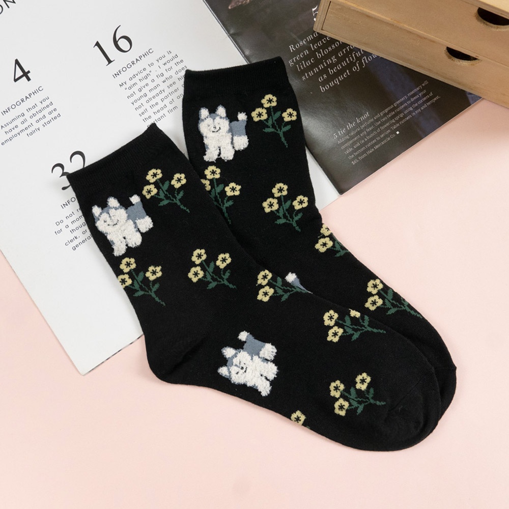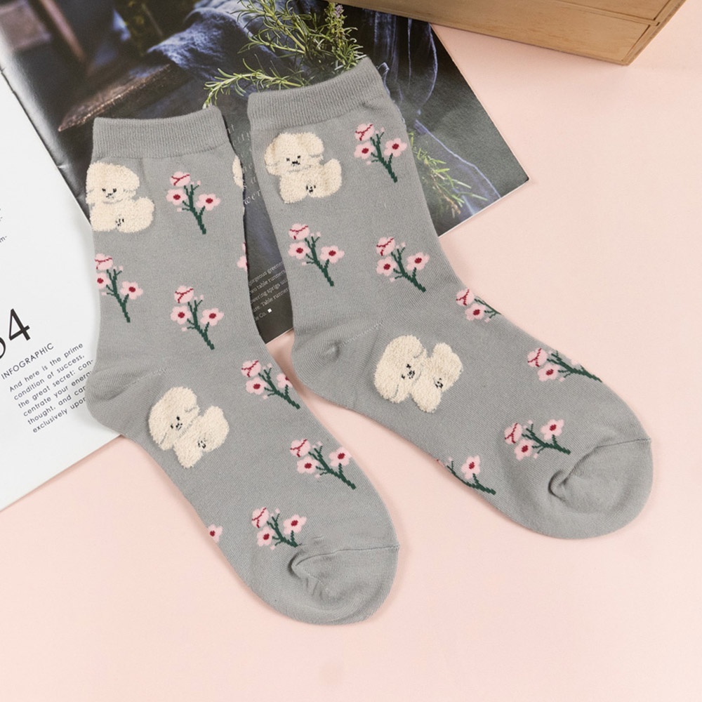 AHUA阿華有事嗎 韓國襪子 滿版毛毛狗狗花束中筒襪 女襪 K1615 襪子推薦 流行襪首選 長襪 純棉襪