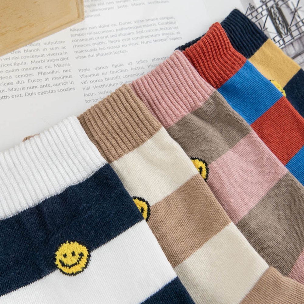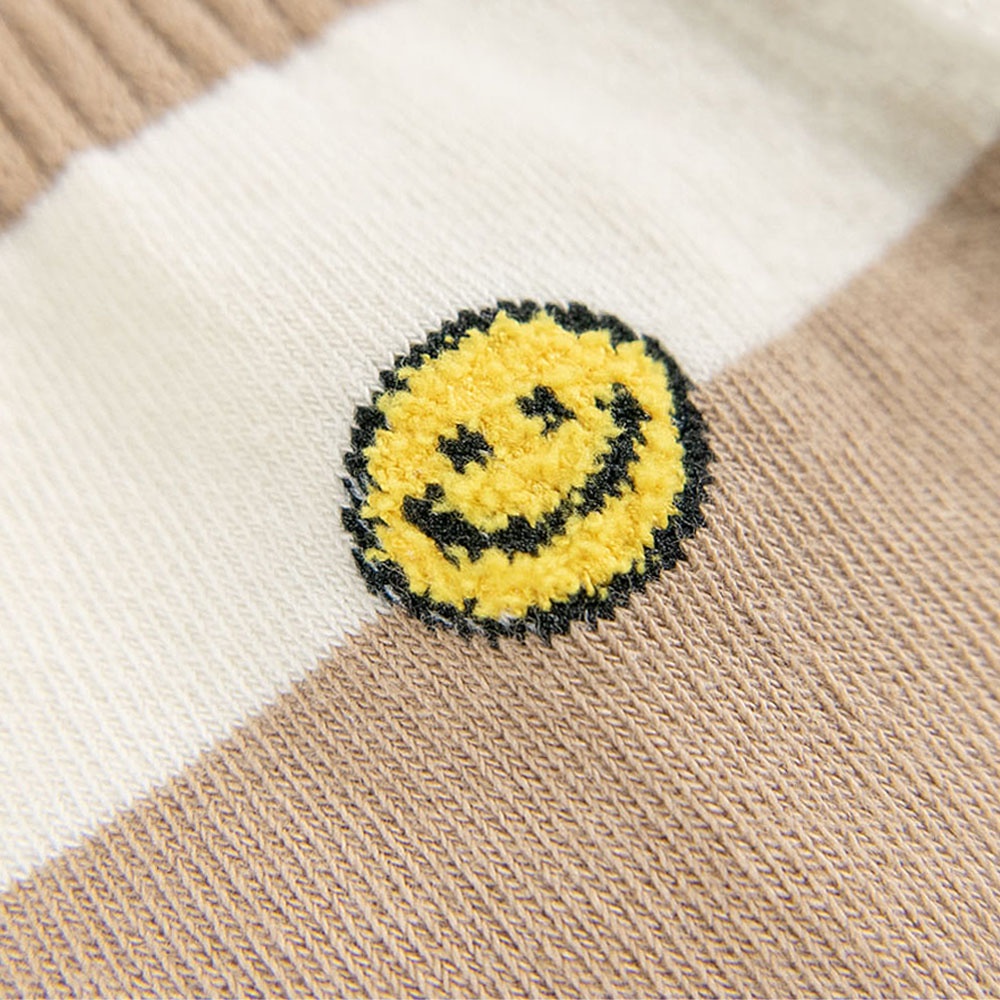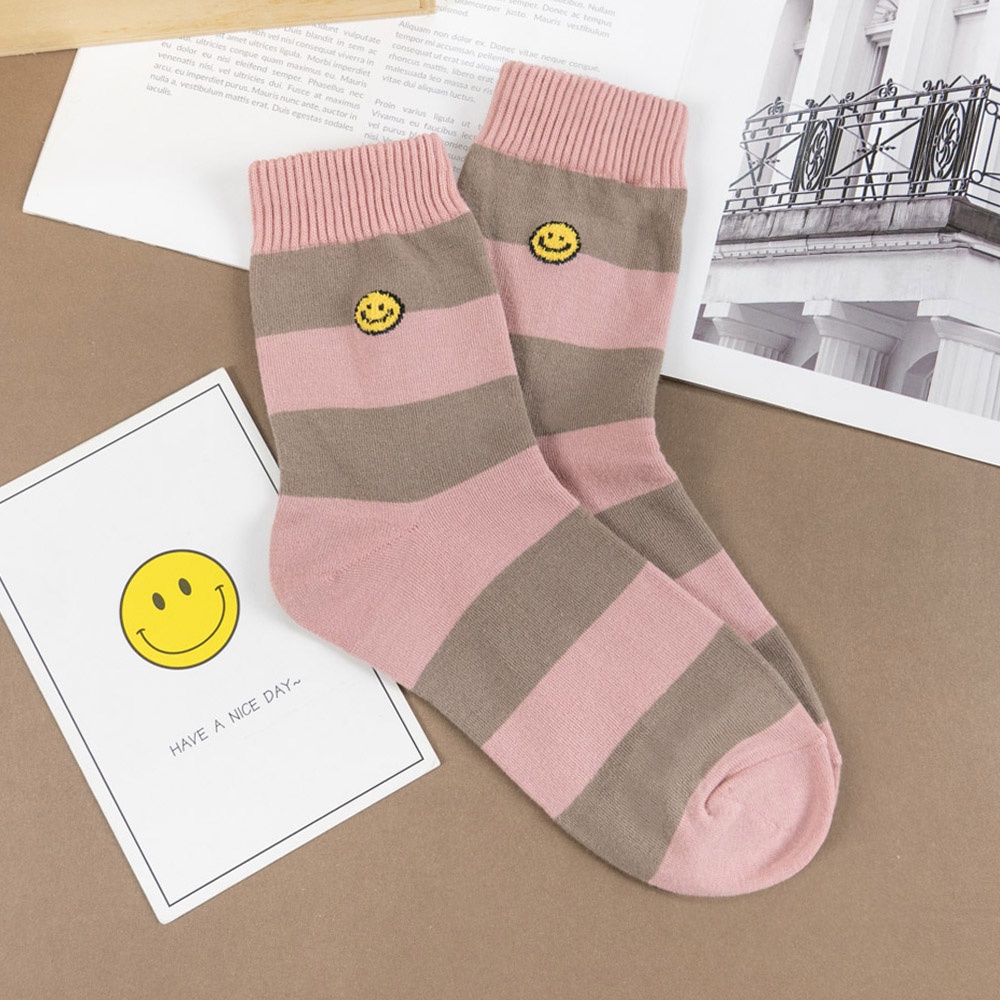 AHUA阿華有事嗎 韓國襪子 毛毛小笑臉雙色粗條紋中筒襪 K1521 條紋 印花 女襪 中筒襪 百搭純棉襪
