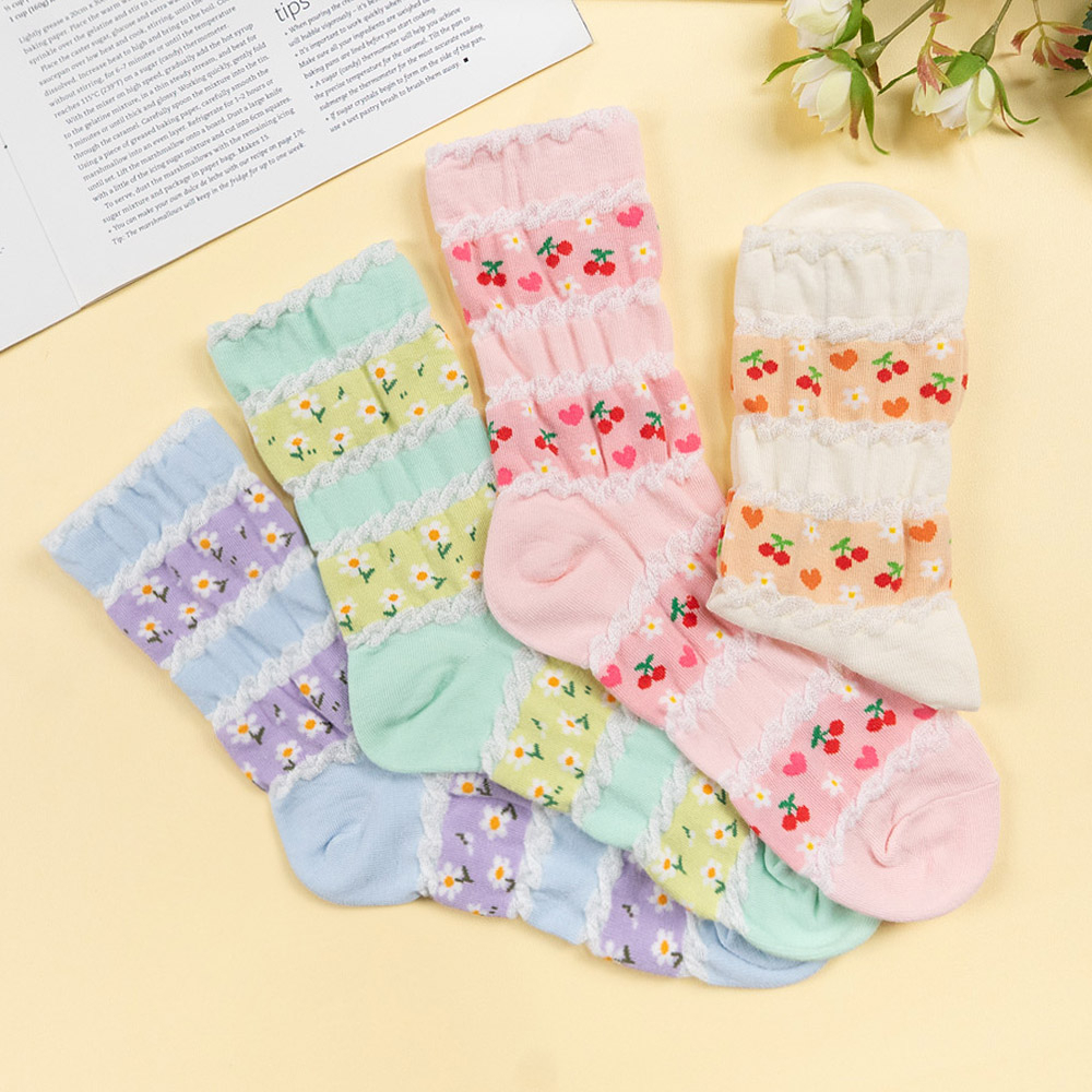 AHUA阿華有事嗎 韓國襪子 立體小花拼色條紋中筒襪 女襪 K1654 推薦流行襪首選 日系 可愛 長襪 少女 拼色