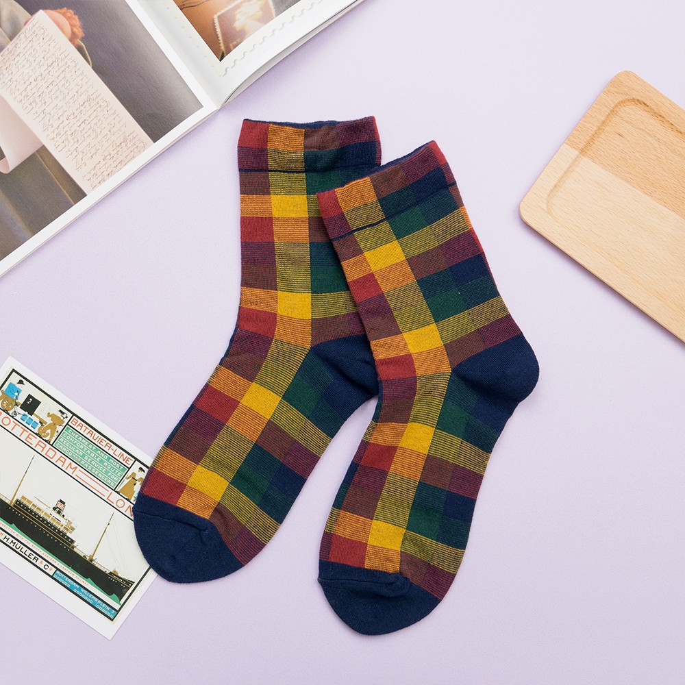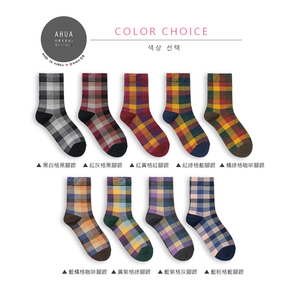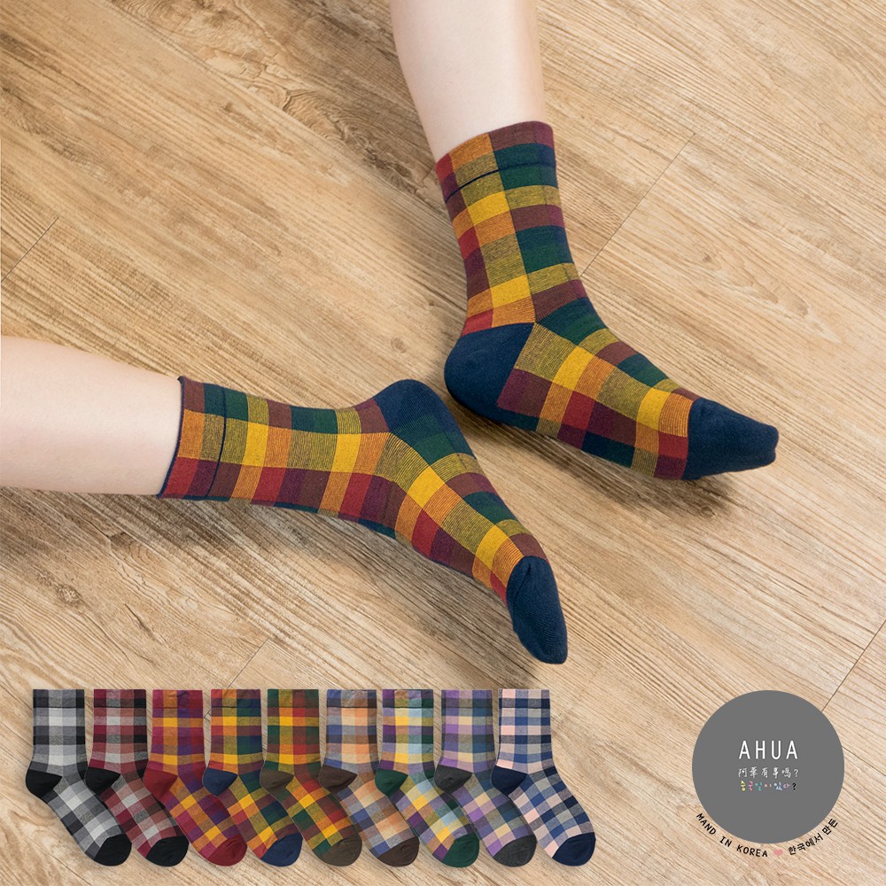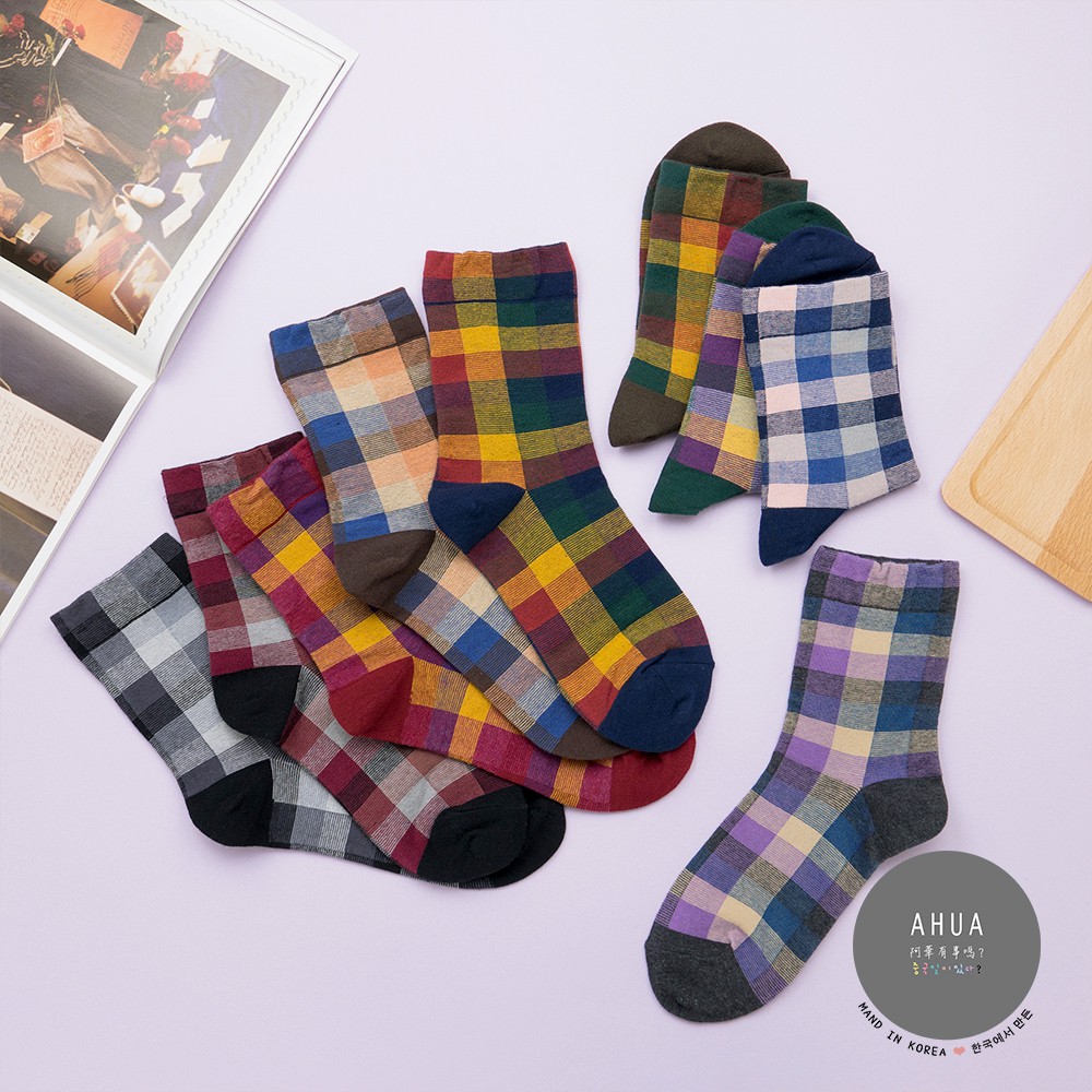 AHUA阿華有事嗎 韓國襪子 復古拼色格紋中筒襪 K0668 正韓少女襪 韓妞必備長襪 百搭純棉襪 素色襪子