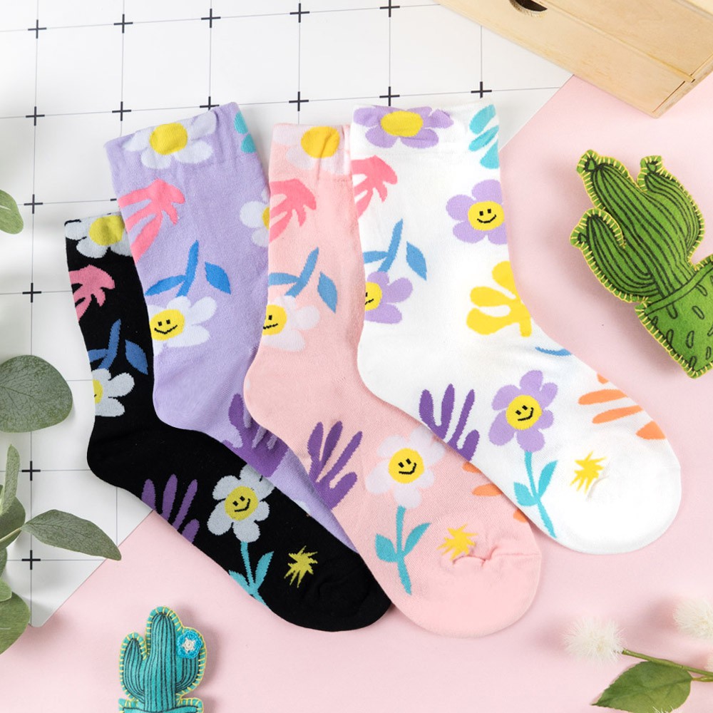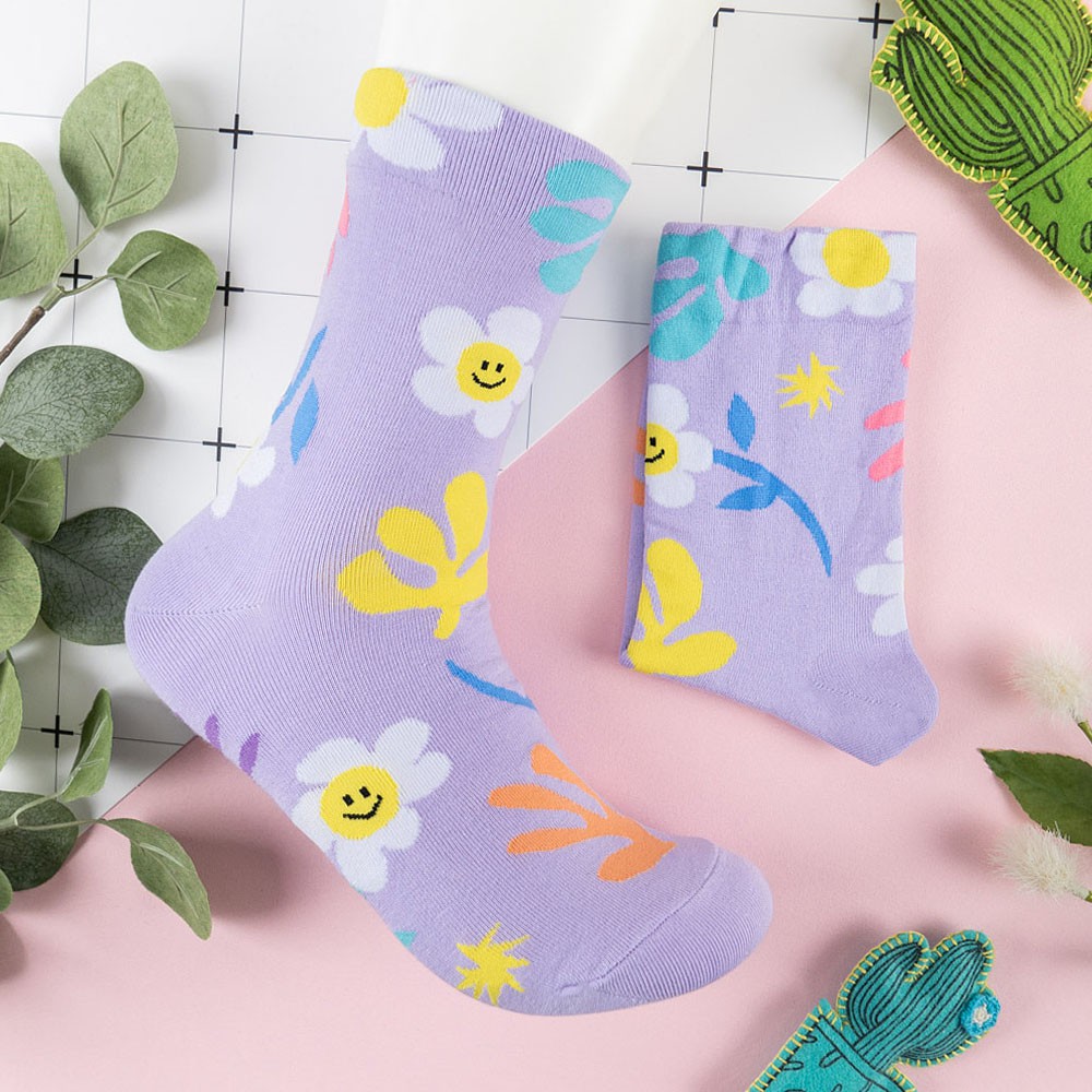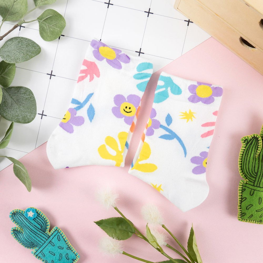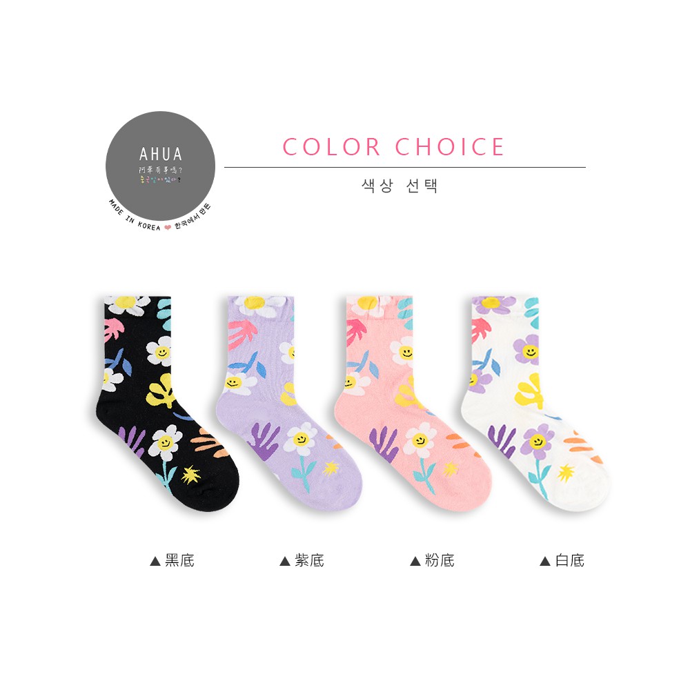 阿華有事嗎AUHA 韓國襪子 滿版繽紛微笑花朵中筒襪 K1089 少女襪 韓妞必備長襪 百搭純棉襪