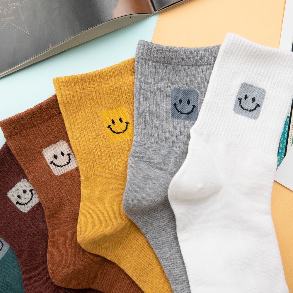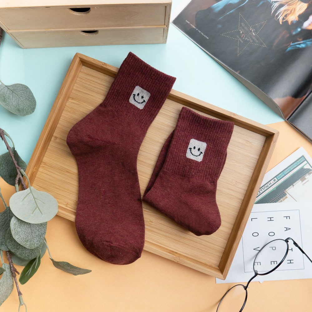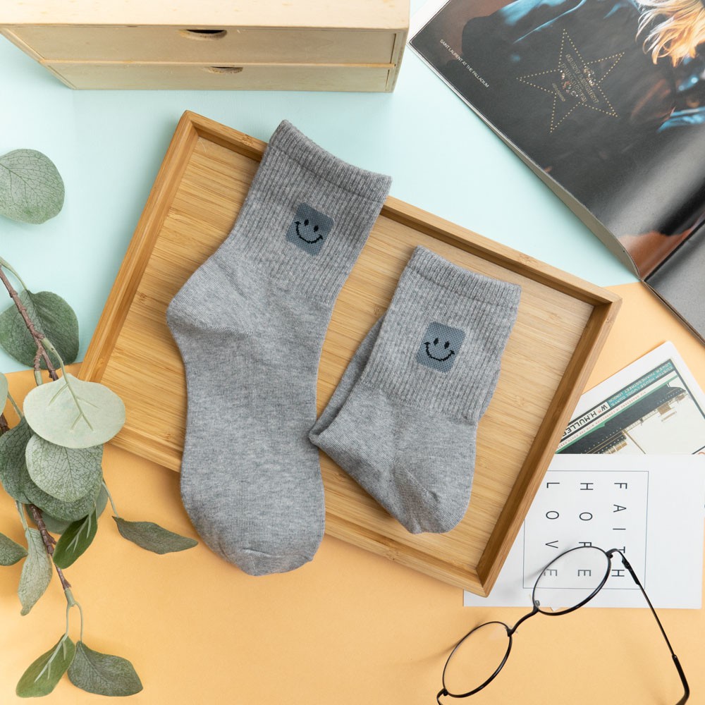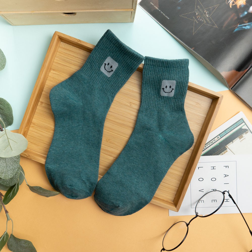 阿華有事嗎AUHA 韓國襪子 素色百搭方塊笑臉中筒襪 K0908 少女襪 韓妞必備長襪 百搭純棉襪