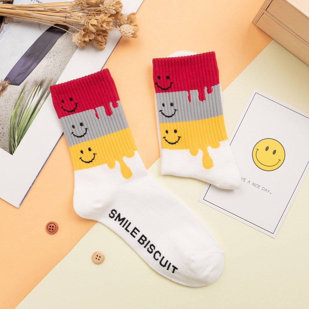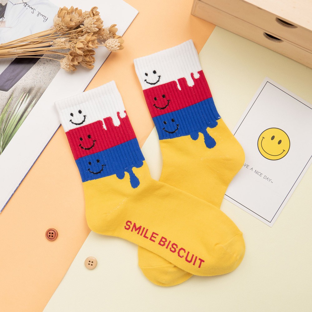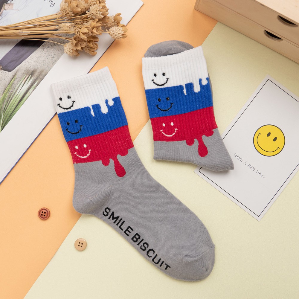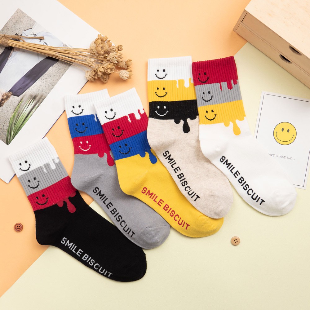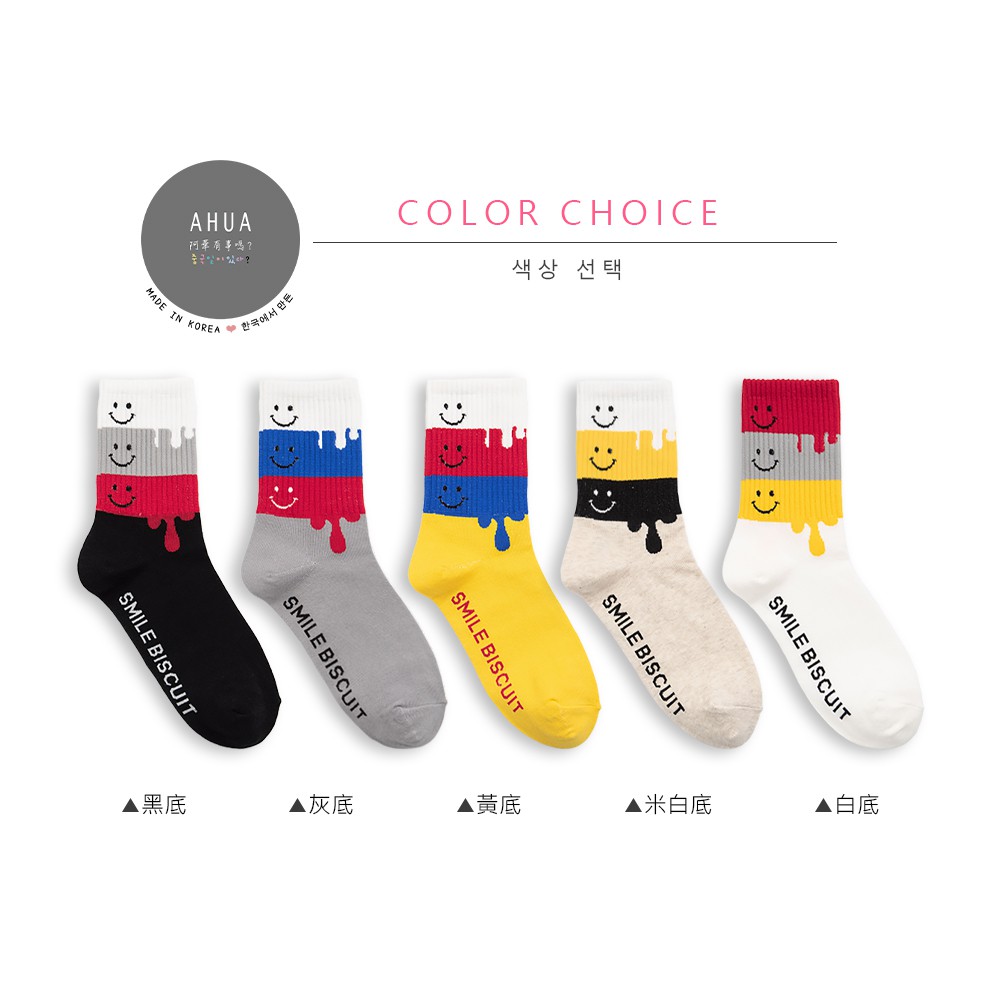AHUA阿華有事嗎 韓國襪子 微笑融化四色拼接中筒襪 K0820 正韓少女襪 韓妞必備卡通襪 百搭純棉襪 素色襪子