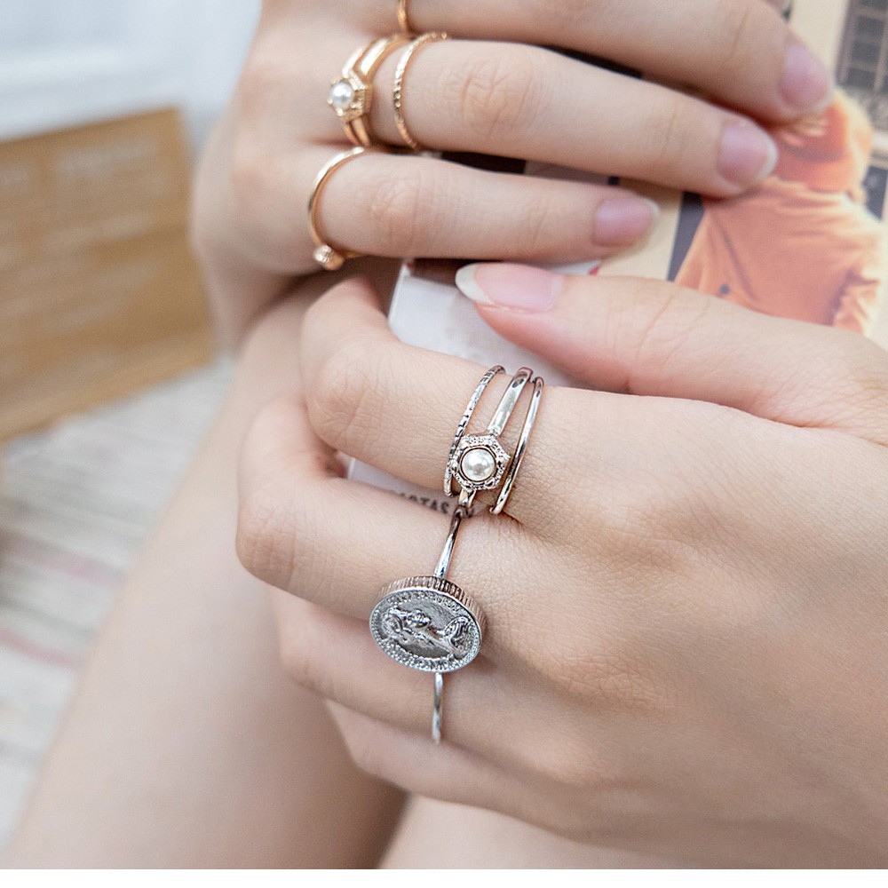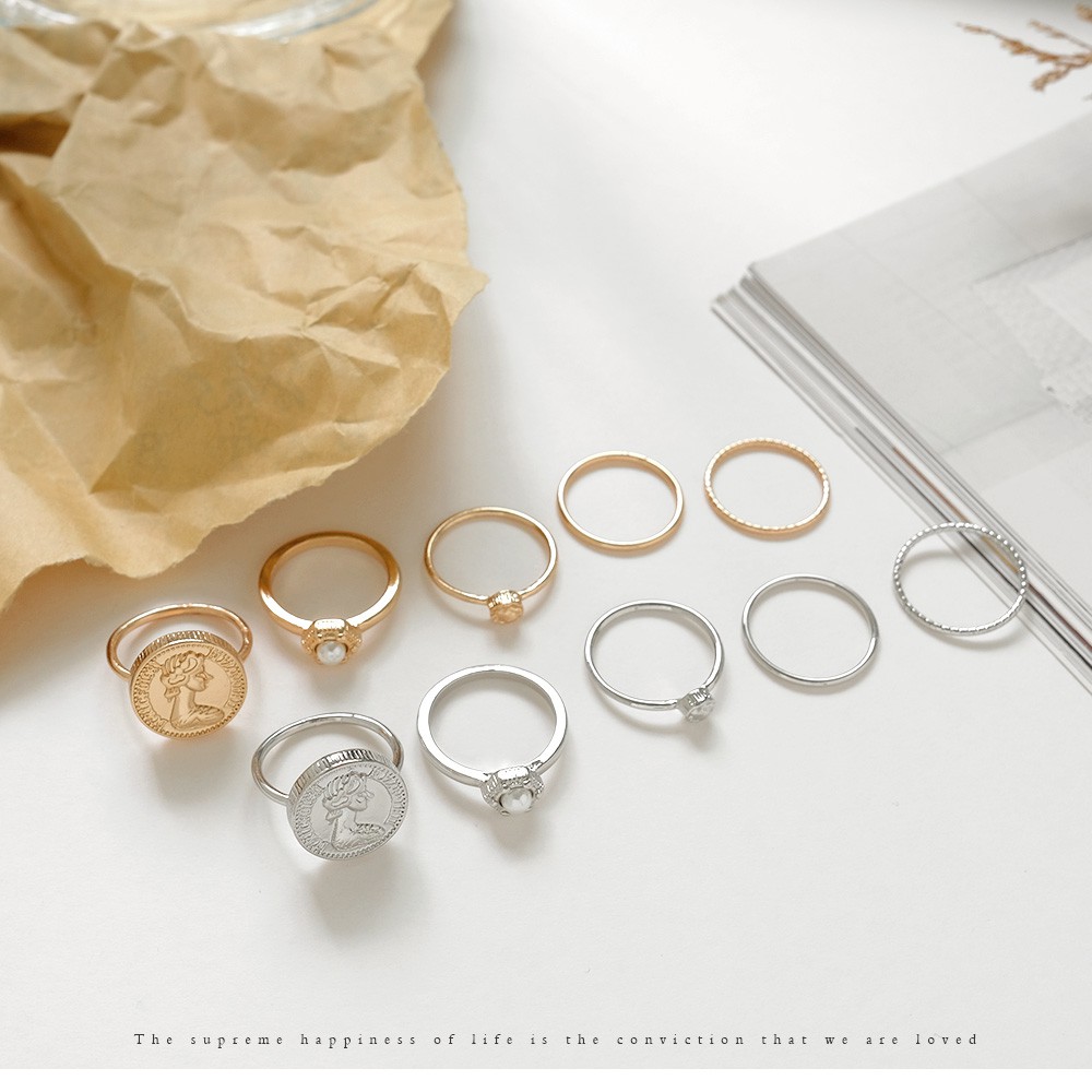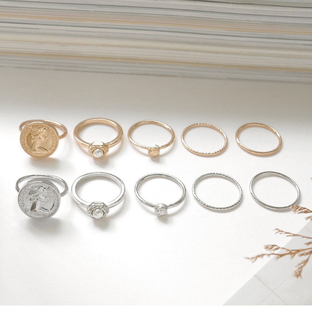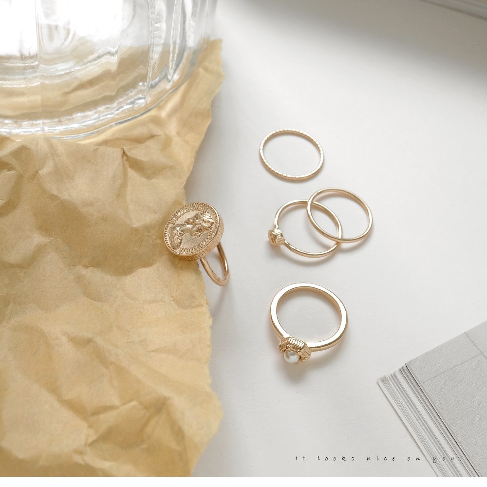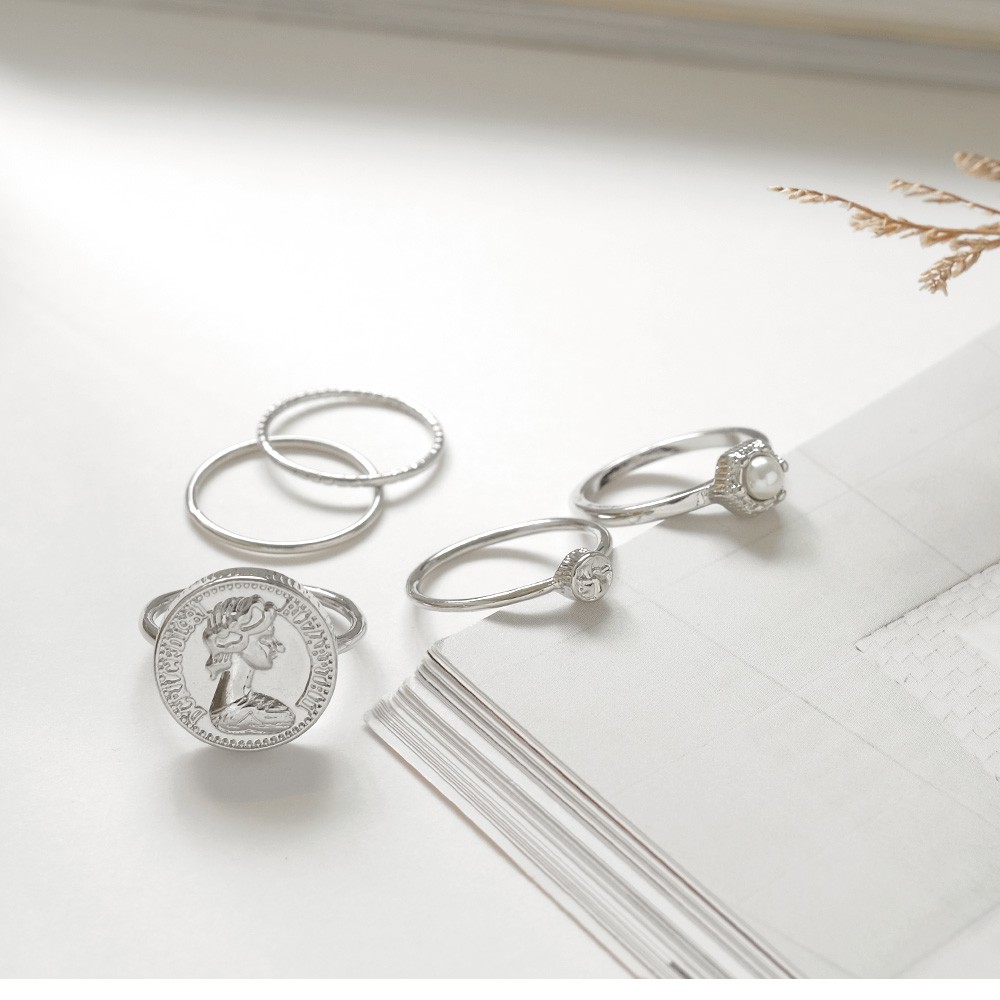 AUHA阿華有事嗎 韓國飾品 復古金幣珍珠戒指5入組【A0624】正韓 Ins風 時尚 簡約 氣質 百搭 硬幣 多入組