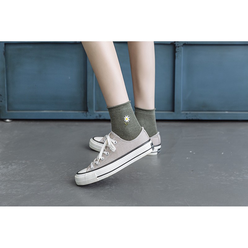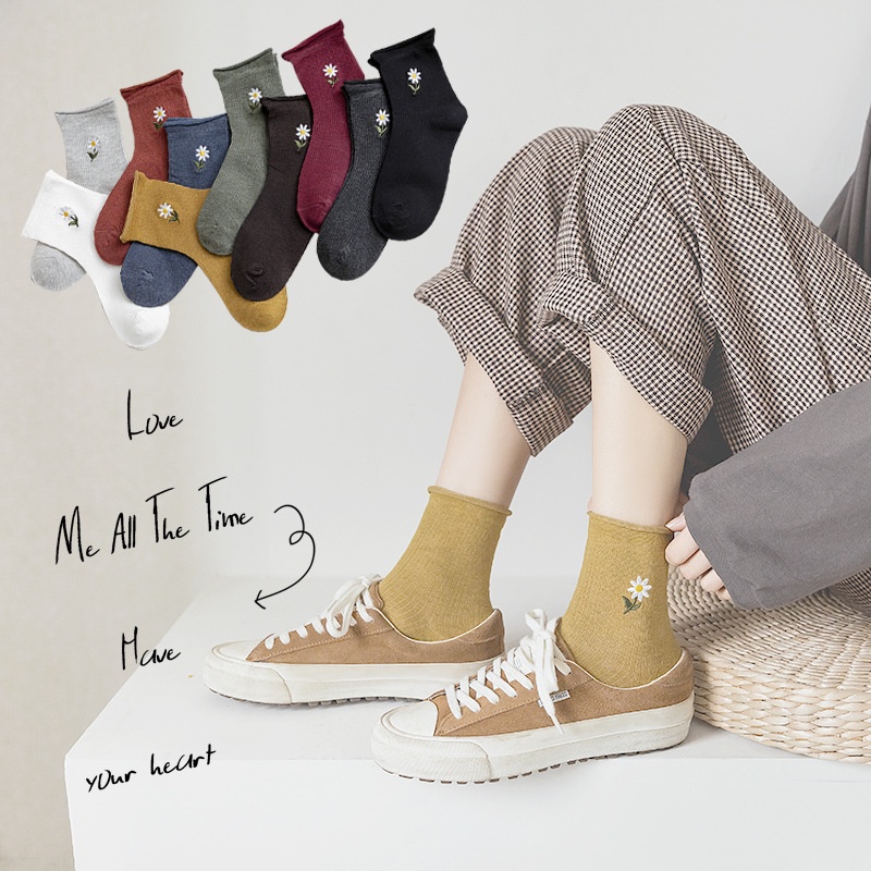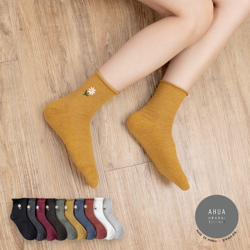AHUA阿華有事嗎 日系襪子 捲邊刺繡小雛菊中筒襪 S0342 韓系少女襪 純棉襪 百搭熱賣爆款【新品優惠】