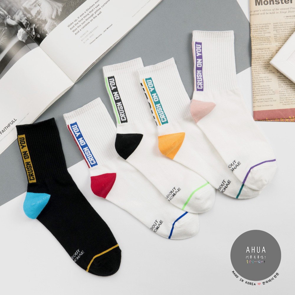 AHUA阿華有事嗎 韓國襪子 彩色標籤後跟英文字中筒襪 K0734 正韓少女襪 韓妞必備長襪 百搭純棉襪 素色襪子