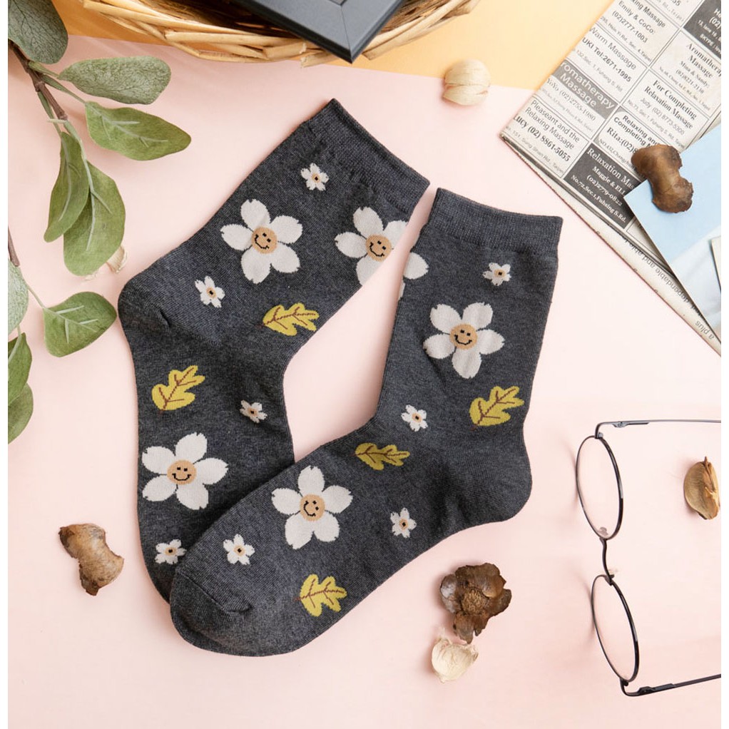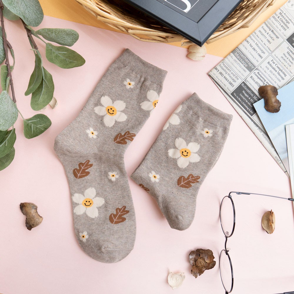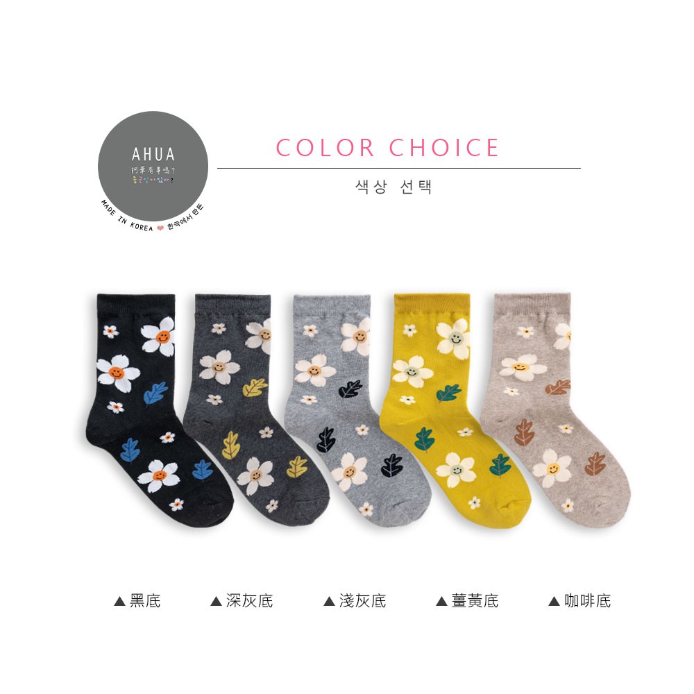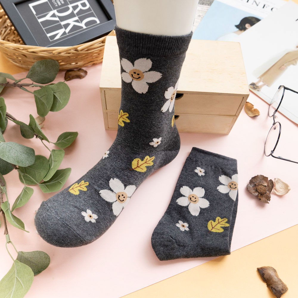 阿華有事嗎AUHA 韓國襪子 落葉笑臉花朵中筒襪 K0906 少女襪 韓妞必備長襪 百搭純棉襪