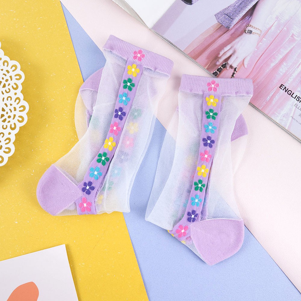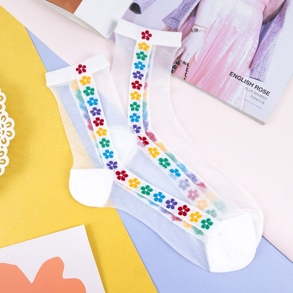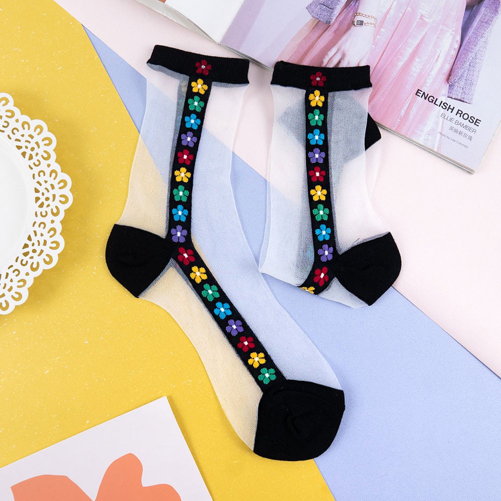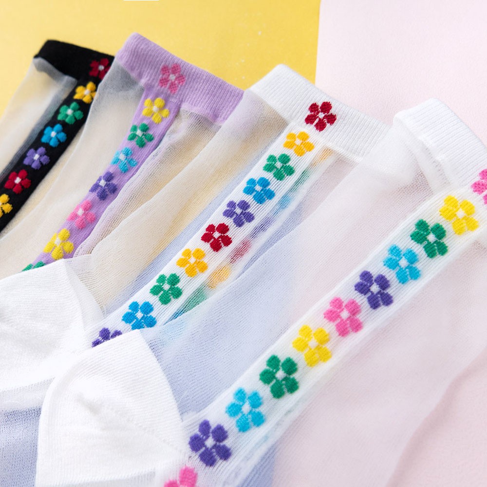 阿華有事嗎AUHA 韓國襪子 透膚側邊直條小花朵中筒襪【K1129】 少女襪 韓妞必備長襪 百搭純棉襪