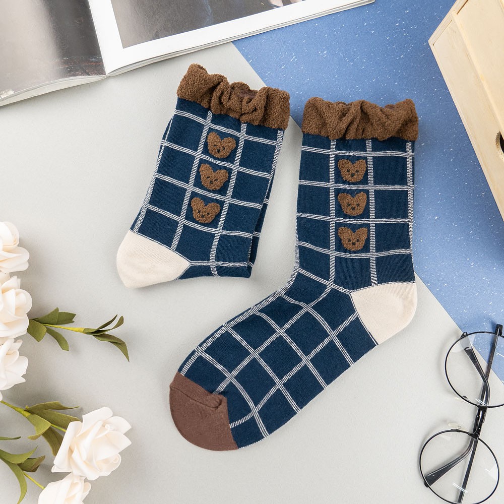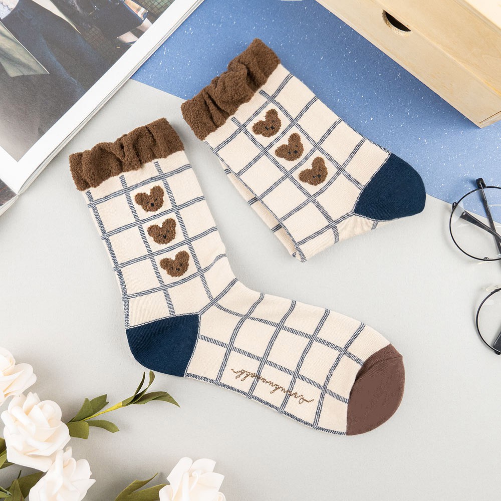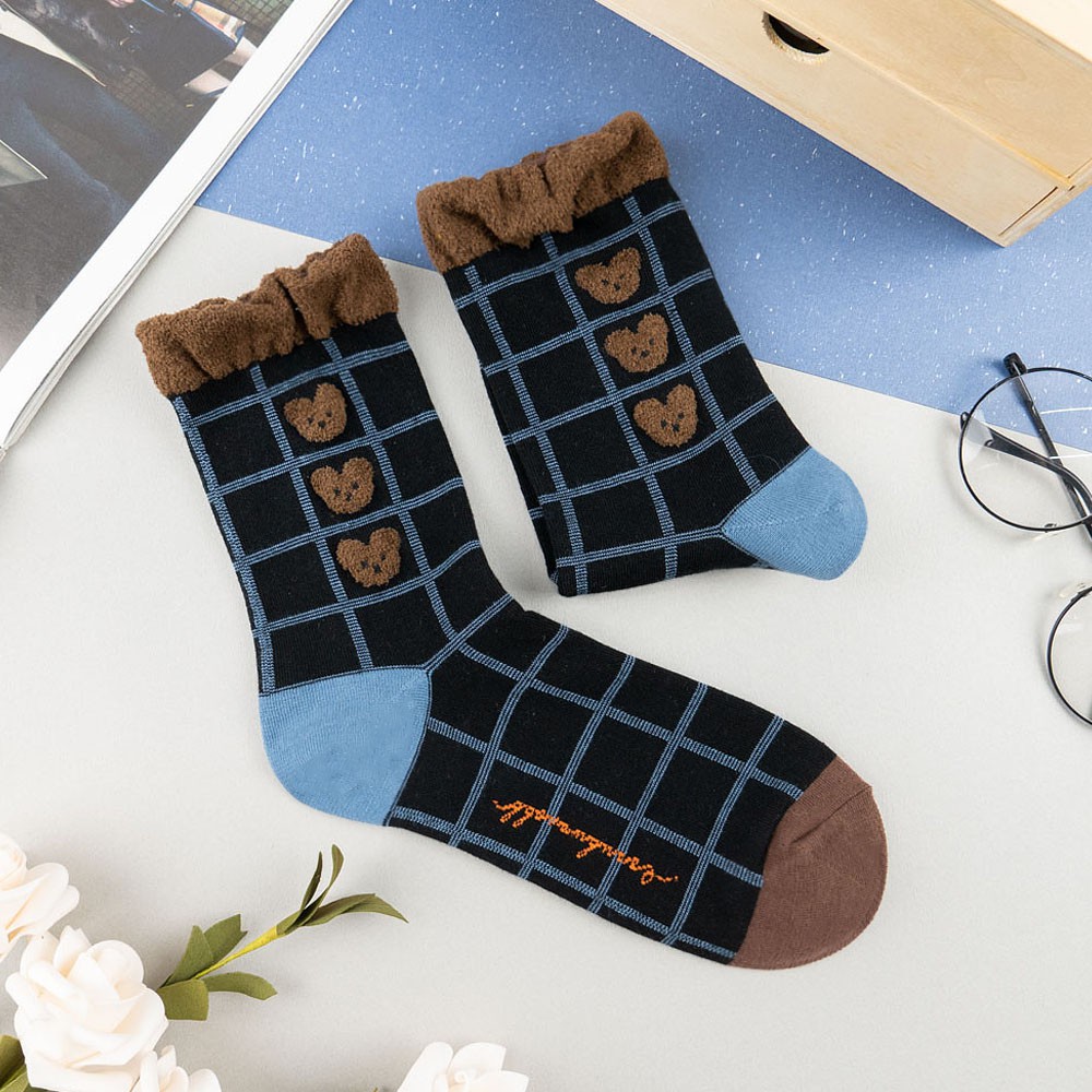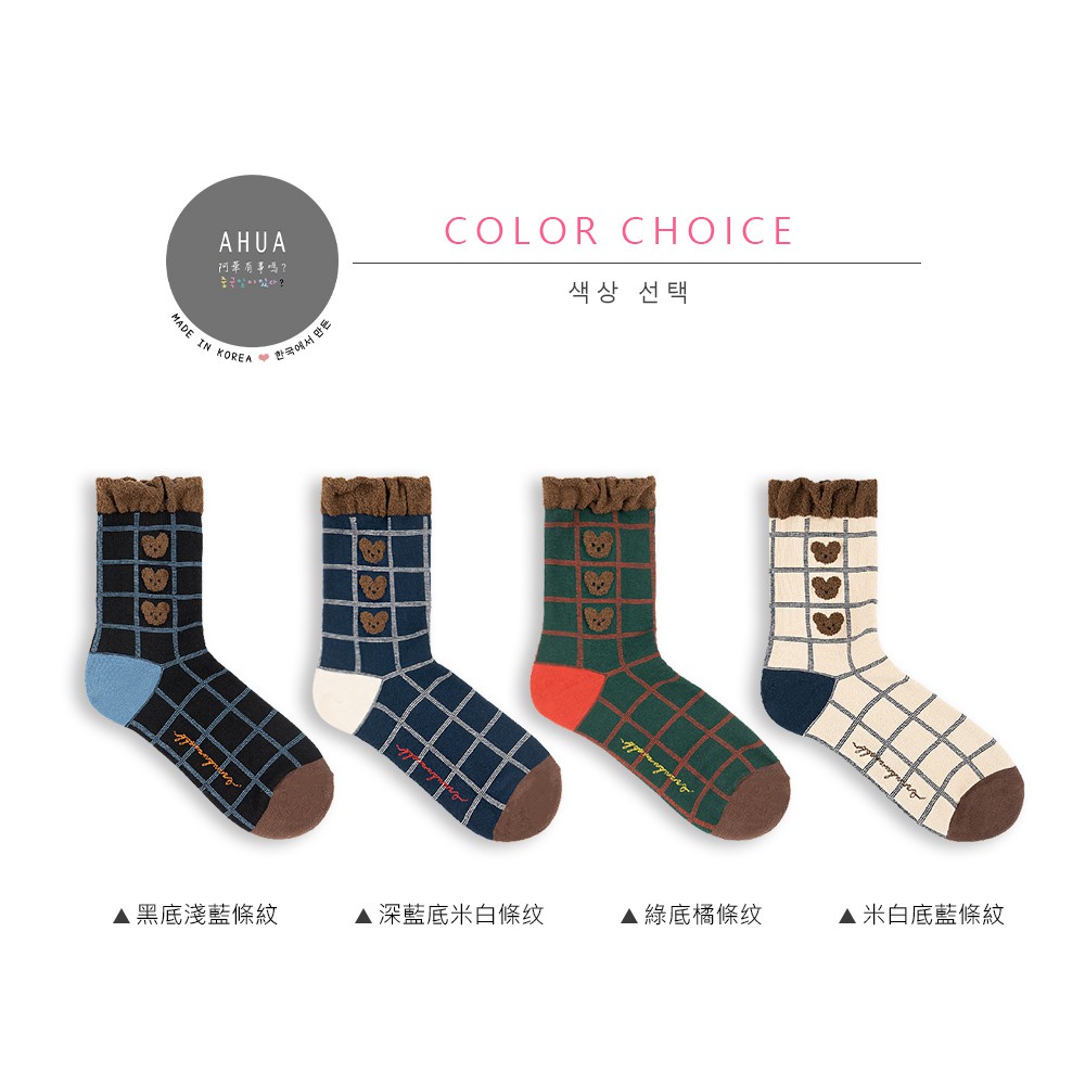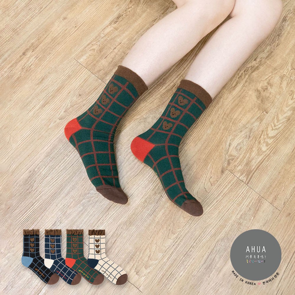 AHUA阿華有事嗎 韓國襪子 毛毛襪口熊熊格紋中筒襪 K1006 少女襪 韓妞必備長襪 百搭純棉襪
