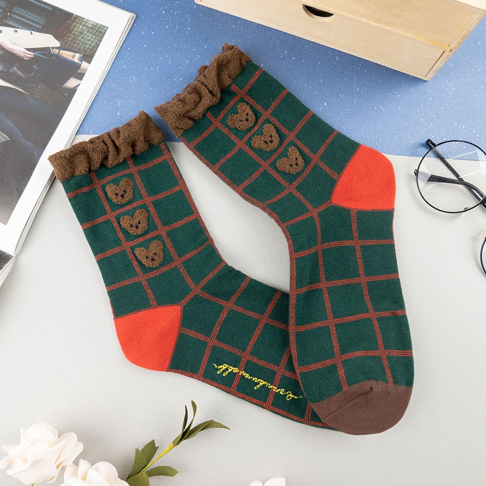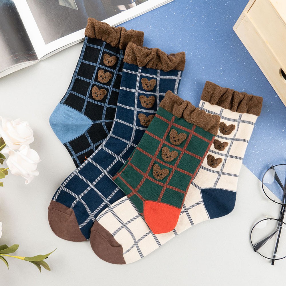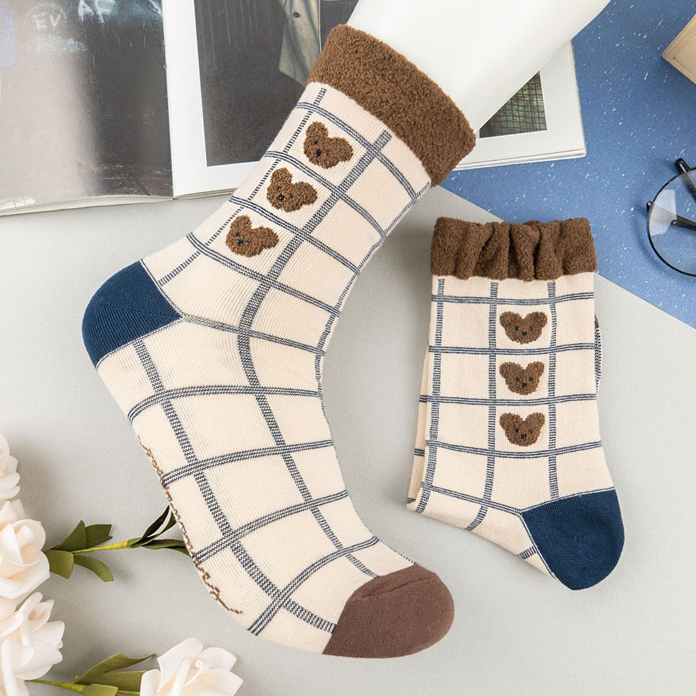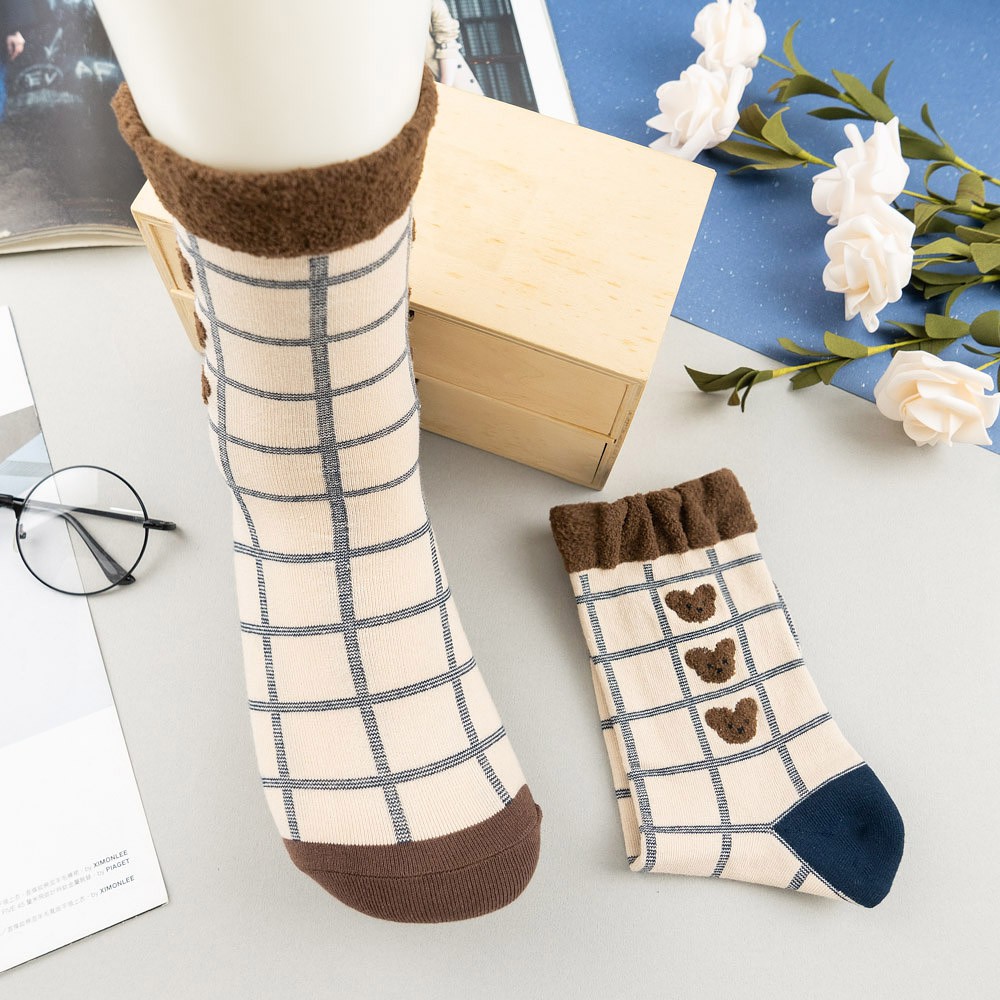 AHUA阿華有事嗎 韓國襪子 毛毛襪口熊熊格紋中筒襪 K1006 少女襪 韓妞必備長襪 百搭純棉襪