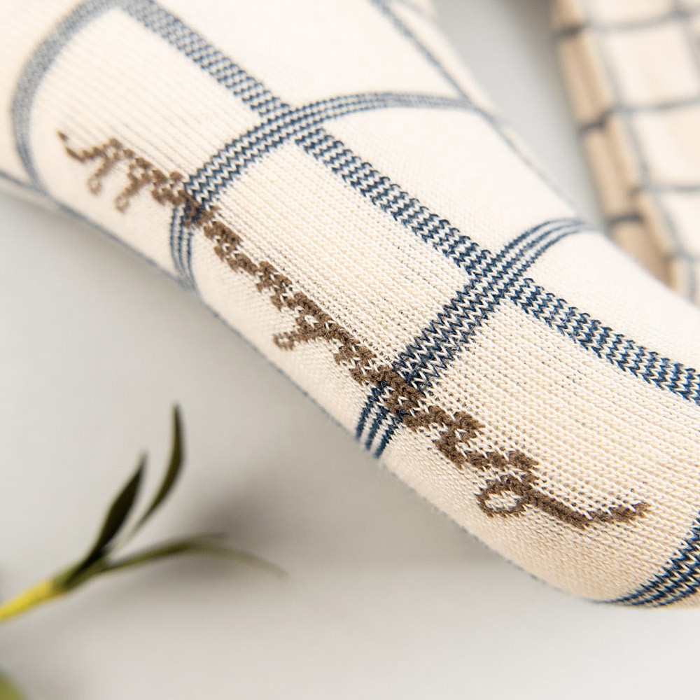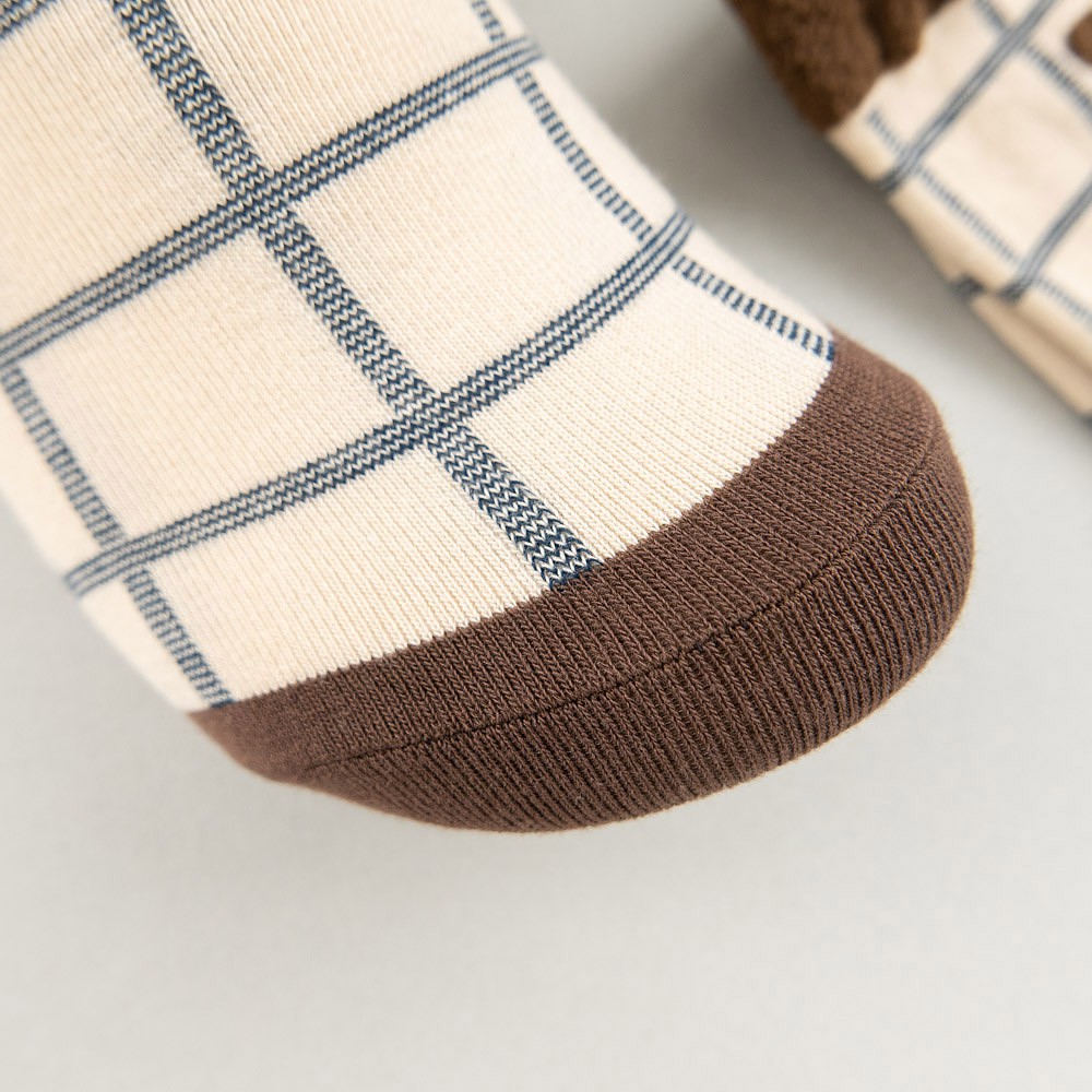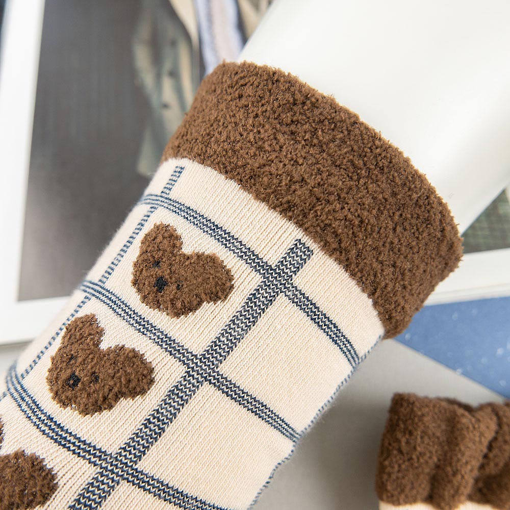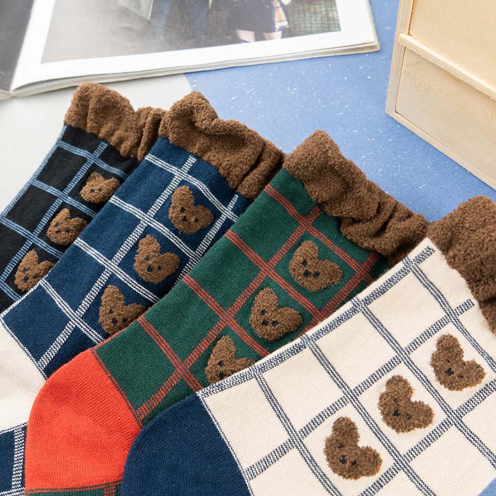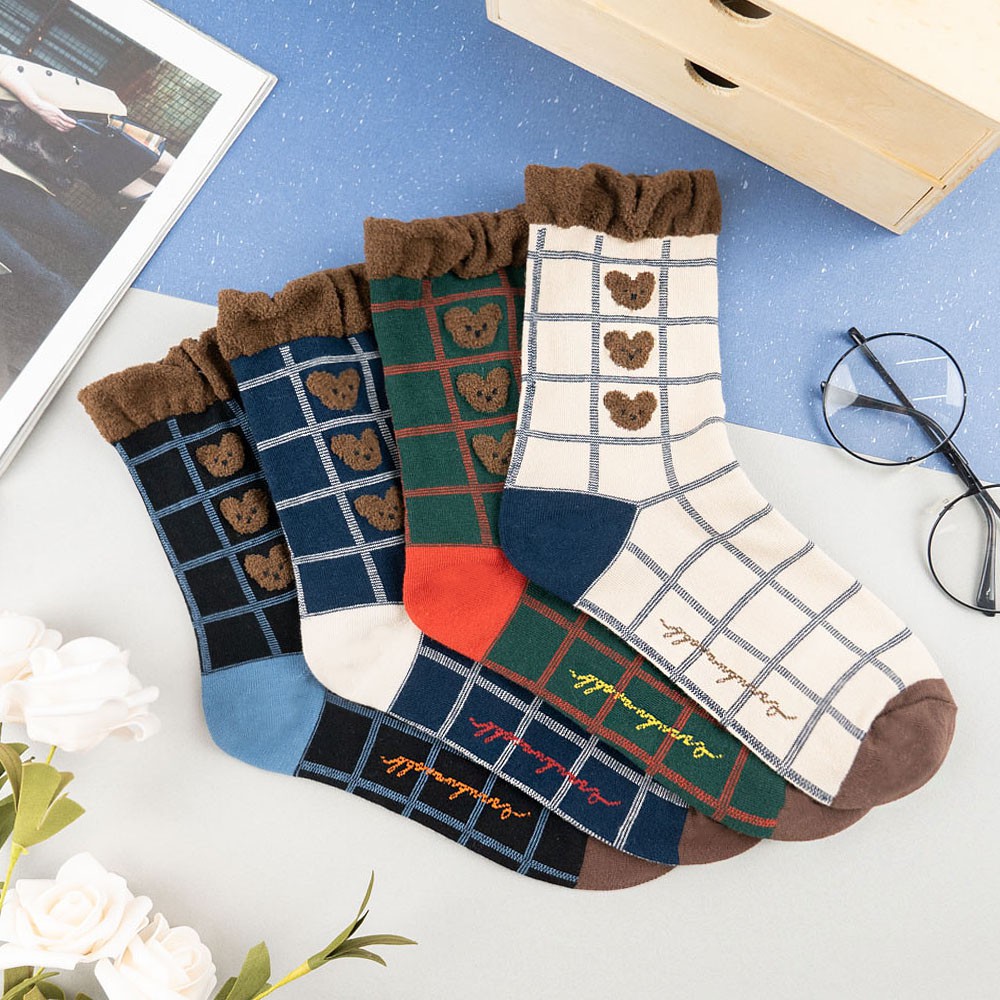 AHUA阿華有事嗎 韓國襪子 毛毛襪口熊熊格紋中筒襪 K1006 少女襪 韓妞必備長襪 百搭純棉襪