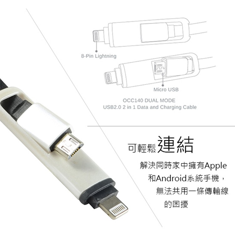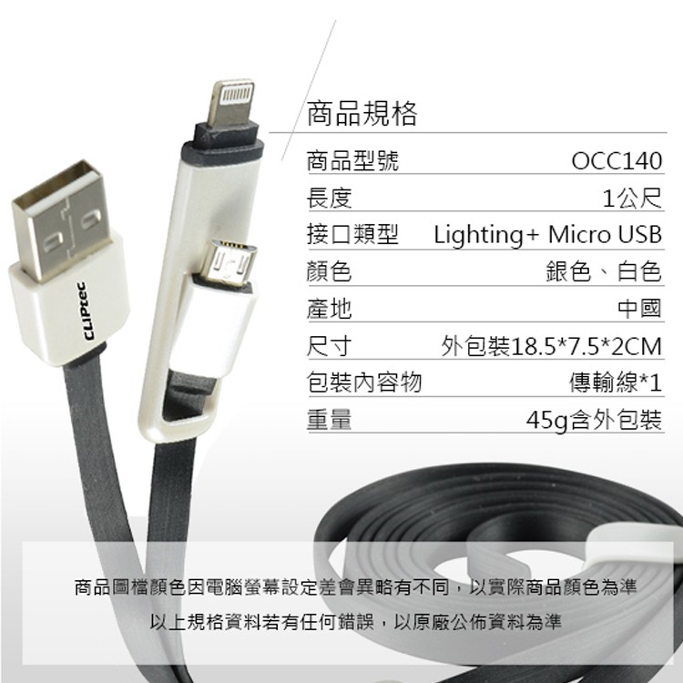 【CLiptec】二合一充電線 傳輸線 Lightning+ Micro USB 1m 兩用充電線